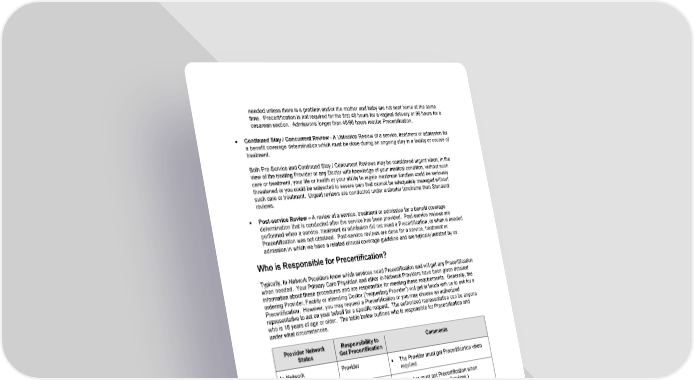 39 needed unless there is a problem and/or the mother and baby are not sent home at the same time. Precertification is not required for the first 48 hours for a vaginal delivery or 96 hours for a cesarean section. Admissions longer than 48/96 hours require Precertification. • Continued Stay / Concurrent Review - A Utilization Review of a service, treatment or admission for a benefit coverage determination which must be done during an ongoing stay in a facility or course of treatment. Both Pre-Service and Continued Stay / Concurrent Reviews may be considered urgent when, in the view of the treating Provider or any Doctor with knowledge of your medical condition, without such care or treatment, your life or health or your ability to regain maximum function could be seriously threatened or you could be subjected to severe pain that cannot be adequately managed without such care or treatment. Urgent reviews are conducted under a shorter timeframe than Standard: reviews. • Post-service Review – A review of a service, treatment or admission for a benefit coverage determination that is conducted after the service has been provided. Post-service reviews are performed when a service, treatment or admission did not need a Precertification, or when a needed Precertification was not obtained. Post-service reviews are done for a service, treatment or admission in which we have a related clinical coverage guideline and are typically initiated by us. Who is Responsible for Precertification? Typically, In-Network Providers know which services need Precertification and will get any Precertification when needed. Your Primary Care Physician and other In-Network Providers have been given detailed information about these procedures and are responsible for meeting these requirements. Generally, the ordering Provider, Facility or attending Doctor (“requesting Provider”) will get in touch with us to ask for a Precertification. However, you may request a Precertification or you may choose an authorized representative to act on your behalf for a specific request. The authorized representative can be anyone who is 18 years of age or older. The table below outlines who is responsible for Precertification and under what circumstances. Provider Network Status Responsibility to Get Precertification Comments In-Network Provider • The Provider must get Precertification when required. Out-of- Network/ Non-Participating Member • Member must get Precertification when required. (Call Member Services.) • Member may be financially responsible for charges/costs related to the service and/or setting in whole or in part if the service and/or setting is found to not be Medically Necessary. BlueCard Provider Member (Except for Inpatient Admissions) • Member must get Precertification when required. (Call Member Services.) • Member may be financially responsible for charges/costs related to the service and/or setting in whole or in part if the service and/or setting is found to not be Medically Necessary. • BlueCard Providers must obtain