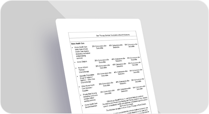 20 See “Therapy Services” for details on Benefit Maximums. Home Health Care • Home Health Care Visits from a Home Health Care Agency (Including intermittent skilled nursing services) 20% Coinsurance after Deductible 40% Coinsurance after Deductible 50% Coinsurance after Deductible • Home Dialysis 20% Coinsurance after Deductible 40% Coinsurance after Deductible 50% Coinsurance after Deductible • Home Infusion Therapy / Chemotherapy 20% Coinsurance after Deductible 40% Coinsurance after Deductible 50% Coinsurance after Deductible • Specialty Prescription Drugs for Infusion / Injection – Other than Chemotherapy 20% Coinsurance after Deductible 40% Coinsurance after Deductible 50% Coinsurance after Deductible • Other Home Health Care Services / Supplies 20% Coinsurance after Deductible 40% Coinsurance after Deductible 50% Coinsurance after Deductible • Private Duty Nursing (Including continuous complex skilled nursing services) 20% Coinsurance after Deductible 40% Coinsurance after Deductible 50% Coinsurance after Deductible • Home Health Care Benefit Maximum 120 visits per Benefit Period, In- and Out-of-Network combined The limit includes Private Duty Nursing and Therapy Services* (e.g., physical, speech, occupational, cardiac and pulmonary rehabilitation) given as part of the Home Care benefit. The limit does not apply to Home Infusion Therapy or Home Dialysis. *If Therapy Services are provided for a Mental Health or Substance Use Disorder condition (based on the primary diagnosis on the claim form), benefits will be paid under the Mental Health and Substance Use Disorder benefits and the Home Health Care limit will not apply. Home Infusion Therapy See “Home Health Care.” Hospice Care • Home Hospice Care No Copayment, Deductible, or Coinsurance No Copayment, Deductible, or Coinsurance No Copayment, Deductible, or Coinsurance