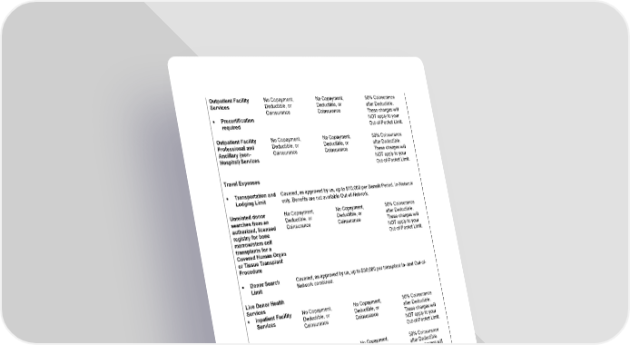 32 Outpatient Facility Services • Precertification required No Copayment, Deductible, or Coinsurance No Copayment, Deductible, or Coinsurance 50% Coinsurance after Deductible. These charges will NOT apply to your Out-of-Pocket Limit. Outpatient Facility Professional and Ancillary (non- Hospital) Services No Copayment, Deductible, or Coinsurance No Copayment, Deductible, or Coinsurance 50% Coinsurance after Deductible. These charges will NOT apply to your Out-of-Pocket Limit. Travel Expenses • Transportation and Lodging Limit Covered, as approved by us, up to $10,000 per Benefit Period. In-Network only. Benefits are not available Out-of-Network. Unrelated donor searches from an authorized, licensed registry for bone marrow/stem cell transplants for a Covered Human Organ or Tissue Transplant Procedure No Copayment, Deductible, or Coinsurance No Copayment, Deductible, or Coinsurance 50% Coinsurance after Deductible. These charges will NOT apply to your Out-of-Pocket Limit. • Donor Search Limit Covered, as approved by us, up to $30,000 per transplant In- and Out-of- Network combined. Live Donor Health Services • Inpatient Facility Services No Copayment, Deductible, or Coinsurance No Copayment, Deductible, or Coinsurance 50% Coinsurance after Deductible. These charges will NOT apply to your Out-of-Pocket Limit. • Outpatient Facility Services No Copayment, Deductible, or Coinsurance No Copayment, Deductible, or Coinsurance 50% Coinsurance after Deductible. These charges will NOT apply to your Out-of-Pocket Limit. • Donor Health Service Limit For Human Organ and Tissue Transplants, Medically Necessary charges for getting an organ from a live donor are covered up to our Maximum Allowed Amount, including complications from the donor procedure for up to six weeks from the date of procurement. How Your Plan Works Introduction