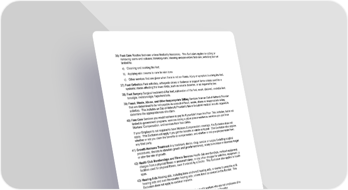 71 36) Foot Care Routine foot care unless Medically Necessary. This Exclusion applies to cutting or removing corns and calluses; trimming nails; cleaning and preventive foot care, including but not limited to: a) Cleaning and soaking the feet. b) Applying skin creams to care for skin tone. c) Other services that are given when there is not an illness, injury or symptom involving the foot. 37) Foot Orthotics Foot orthotics, orthopedic shoes or footwear or support items unless used for a systemic illness affecting the lower limbs, such as severe diabetes, or as required by law. 38) Foot Surgery Surgical treatment of flat feet; subluxation of the foot; weak, strained, unstable feet; tarsalgia; metatarsalgia; hyperkeratosis. 39) Fraud, Waste, Abuse, and Other Inappropriate Billing Services from an Out-of-Network Provider that are determined to be not payable as a result of fraud, waste, abuse or inappropriate billing activities. This includes an Out-of-Network Provider's failure to submit medical records required to determine the appropriateness of a claim. 40) Free Care Services you would not have to pay for if you didn’t have this Plan. This includes, but is not limited to government programs, services during a jail or prison sentence, services you get from Workers’ Compensation, and services from free clinics. If your Employer is not required to have Workers Compensation coverage, this Exclusion does not apply. This Exclusion will apply if you get the benefits in whole or in part. This Exclusion also applies whether or not you claim the benefits or compensation, and whether or not you get payments from any third party. 41) Growth Hormone Treatment Any treatment, device, drug, service or supply (including surgical procedures, devices to stimulate growth and growth hormones), solely to increase or decrease height or alter the rate of growth. 42) Health Club Memberships and Fitness Services Health club memberships, workout equipment, charges from a physical fitness or personal trainer, or any other charges for activities, equipment, or facilities used for physical fitness, even if ordered by a Doctor. This Exclusion also applies to health spas. 43) Hearing Aids Hearing aids, including bone-anchored hearing aids, or exams to prescribe or fit hearing aids and over-the-counter hearing aids, unless listed as covered in this Booklet. This Exclusion does not apply to cochlear implants. 44) Home Health Care a) Services given by registered nurses and other health workers who are not employees of or working under an approved arrangement with a Home Health Care Provider. b) Food, housing, homemaker services and home delivered meals. 45) Hospital Services Billed Separately Services rendered by Hospital resident Doctors or interns that are billed separately. This includes separately billed charges for services rendered by employees of Hospitals, labs or other institutions, and charges included in other duplicate billings. 46) Hyperhidrosis Treatment Medical and surgical treatment of excessive sweating (hyperhidrosis). 47) Infertility Treatment Testing or treatment related to infertility. 48) Lost, Damaged, Destroyed or Stolen Drugs Refills of lost, damaged, destroyed or stolen Drugs. 49) Maintenance Therapy Rehabilitative treatment given when no further gains are clear or likely to occur. Maintenance therapy includes care that helps you keep your current level of function and prevents loss of that function, but does not result in any change for the better. This Exclusion does not apply to “Habilitative Services” as described in the “What’s Covered” section.