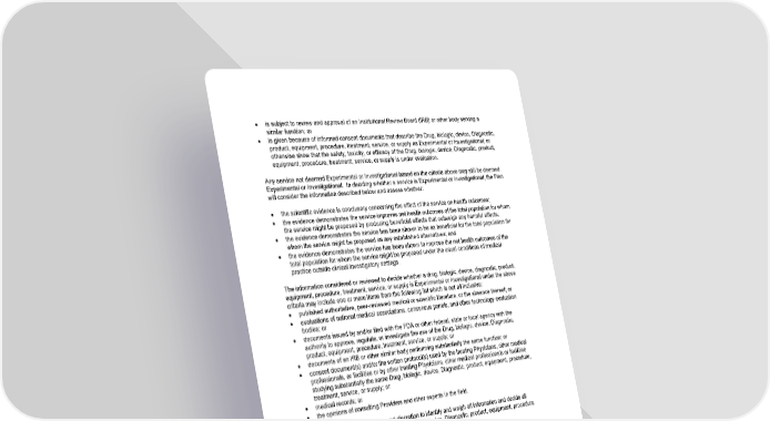 34 • is subject to review and approval of an Institutional Review Board (IRB) or other body serving a similar function; or • is given because of informed consent documents that describe the Drug, biologic, device, Diagnostic, product, equipment, procedure, treatment, service, or supply as Experimental or Investigational, or otherwise show that the safety, toxicity, or efficacy of the Drug, biologic, device, Diagnostic, product, equipment, procedure, treatment, service, or supply is under evaluation. Any service not deemed Experimental or Investigational based on the criteria above may still be deemed Experimental or Investigational. In deciding whether a service is Experimental or Investigational, the Plan will consider the information described below and assess whether: • the scientific evidence is conclusory concerning the effect of the service on health outcomes; • the evidence demonstrates the service improves net health outcomes of the total population for whom the service might be proposed by producing beneficial effects that outweigh any harmful effects; • the evidence demonstrates the service has been shown to be as beneficial for the total population for whom the service might be proposed as any established alternatives; and • the evidence demonstrates the service has been shown to improve the net health outcomes of the total population for whom the service might be proposed under the usual conditions of medical practice outside clinical investigatory settings. The information considered or reviewed to decide whether a drug, biologic, device, diagnostic, product, equipment, procedure, treatment, service, or supply is Experimental or Investigational under the above criteria may include one or more items from the following list which is not all inclusive: • published authoritative, peer-reviewed medical or scientific literature, or the absence thereof; or • evaluations of national medical associations, consensus panels, and other technology evaluation bodies; or • documents issued by and/or filed with the FDA or other federal, state or local agency with the authority to approve, regulate, or investigate the use of the Drug, biologic, device, Diagnostic, product, equipment, procedure, treatment, service, or supply; or • documents of an IRB or other similar body performing substantially the same function; or • consent document(s) and/or the written protocol(s) used by the treating Physicians, other medical professionals, or facilities or by other treating Physicians, other medical professionals or facilities studying substantially the same Drug, biologic, device, Diagnostic, product, equipment, procedure, treatment, service, or supply; or • medical records; or • the opinions of consulting Providers and other experts in the field. The Plan has the sole authority and discretion to identify and weigh all information and decide all questions pertaining to whether a Drug, biologic, device, Diagnostic, product, equipment, procedure, treatment, service, or supply is Experimental or Investigational.