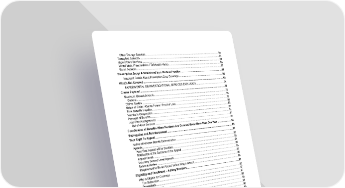 10 Other Therapy Services.......................................................................................................................64 Transplant Services.................................................................................................................................64 Urgent Care Services ..............................................................................................................................64 Virtual Visits (Telemedicine / Telehealth Visits) ......................................................................................65 Vision Services ........................................................................................................................................65 Prescription Drugs Administered by a Medical Provider .....................................................................66 Important Details About Prescription Drug Coverage..........................................................................66 What’s Not Covered ..................................................................................................................................68 EXPERIMENTAL OR INVESTIGATIONAL SERVICES EXCLUSION ................................................74 Claims Payment ........................................................................................................................................76 Maximum Allowed Amount......................................................................................................................76 General ................................................................................................................................................76 Claims Review.........................................................................................................................................79 Notice of Claim / Claims Forms / Proof of Loss.......................................................................................80 Time Benefits Payable.............................................................................................................................80 Member’s Cooperation ............................................................................................................................81 Payment of Benefits ................................................................................................................................81 Inter-Plan Arrangements .........................................................................................................................81 Out-of-Area Services ...........................................................................................................................81 Coordination of Benefits When Members Are Covered Under More Than One Plan ........................84 Subrogation and Reimbursement ...........................................................................................................89 Your Right To Appeal ...............................................................................................................................93 Notice of Adverse Benefit Determination ................................................................................................93 Appeals....................................................................................................................................................93 How Your Appeal will be Decided........................................................................................................94 Notification of the Outcome of the Appeal ...........................................................................................95 Appeal Denial.......................................................................................................................................95 Voluntary Second Level Appeals.........................................................................................................95 External Review...................................................................................................................................95 Requirement to file an Appeal before filing a lawsuit...........................................................................96 Eligibility and Enrollment – Adding Members........................................................................................97 Who is Eligible for Coverage ...................................................................................................................97 The Subscriber.....................................................................................................................................97 Dependents..........................................................................................................................................97 Types of Coverage...............................................................................................................................98 When You Can Enroll..............................................................................................................................98 Initial Enrollment ..................................................................................................................................98 Open Enrollment..................................................................................................................................98 Special Enrollment Periods..................................................................................................................99 Medicaid and Children’s Health Insurance Program Special Enrollment ............................................99 Late Enrollees ......................................................................................................................................99 Members Covered Under the Employer’s Prior Plan...........................................................................99 Enrolling De