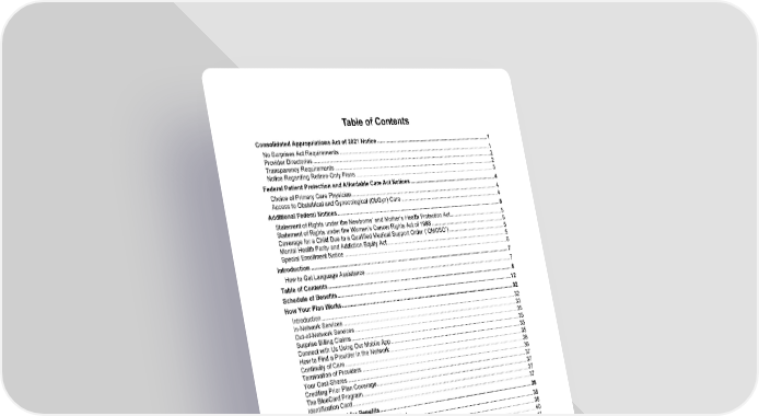 8 Table of Contents Consolidated Appropriations Act of 2021 Notice ....................................................................................1 No Surprises Act Requirements ................................................................................................................1 Provider Directories ...................................................................................................................................2 Transparency Requirements .....................................................................................................................2 Notice Regarding Retiree-Only Plans .......................................................................................................3 Federal Patient Protection and Affordable Care Act Notices .................................................................4 Choice of Primary Care Physician.............................................................................................................4 Access to Obstetrical and Gynecological (ObGyn) Care ..........................................................................4 Additional Federal Notices.........................................................................................................................5 Statement of Rights under the Newborns’ and Mother’s Health Protection Act........................................5 Statement of Rights under the Women’s Cancer Rights Act of 1998 .......................................................5 Coverage for a Child Due to a Qualified Medical Support Order (“QMCSO”)...........................................5 Mental Health Parity and Addiction Equity Act..........................................................................................5 Special Enrollment Notice .........................................................................................................................6 Introduction .................................................................................................................................................7 How to Get Language Assistance .............................................................................................................7 Table of Contents........................................................................................................................................8 Schedule of Benefits.................................................................................................................................12 How Your Plan Works...............................................................................................................................32 Introduction..............................................................................................................................................32 In-Network Services ................................................................................................................................33 Out-of-Network Services .........................................................................................................................35 Surprise Billing Claims.............................................................................................................................35 Connect with Us Using Our Mobile App ..................................................................................................35 How to Find a Provider in the Network....................................................................................................35 Continuity of Care....................................................................................................................................36 Termination of Providers .........................................................................................................................36 Your Cost-Shares ....................................................................................................................................37 Crediting Prior Plan Coverage.................................................................................................................37 The BlueCard Program............................................................................................................................37 Identification Card....................................................................................................................................37 Getting Approval for Benefits..................................................................................................................38 Reviewing Where Services Are Provided................................................................................................38 Types of Reviews ....................................................................................................................................38 Decision and Notice Requirements .........................................................................................................40 Important Information ..............................................................................................................................41 Health Plan Individual Case Management ..............................................................................................41 What’s Covered .........................................................................................................................................43 Allergy Services.......................................................................................................................................43 Ambulance Services................................................................................................................................43 Important Notes on Air Ambulance Benefits........................................................................................44 Athletic Trainer Services.............................................