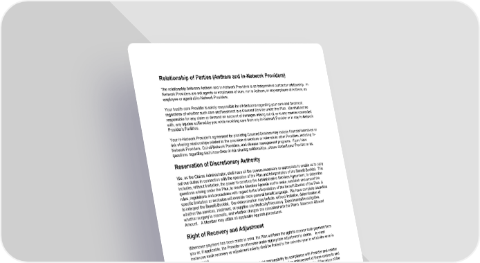 113 Relationship of Parties (Anthem and In-Network Providers) The relationship between Anthem and In-Network Providers is an independent contractor relationship. In- Network Providers are not agents or employees of ours, nor is Anthem, or any employee of Anthem, an employee or agent of In-Network Providers. Your health care Provider is solely responsible for all decisions regarding your care and treatment, regardless of whether such care and treatment is a Covered Service under this Plan. We shall not be responsible for any claim or demand on account of damages arising out of, or in any manner connected with, any injuries suffered by you while receiving care from any In-Network Provider or in any In-Network Provider’s Facilities. Your In-Network Provider’s agreement for providing Covered Services may include financial incentives or risk sharing relationships related to the provision of services or referrals to other Providers, including In- Network Providers, Out-of-Network Providers, and disease management programs. If you have questions regarding such incentives or risk sharing relationships, please contact your Provider or us. Reservation of Discretionary Authority We, as the Claims Administrator, shall have all the powers necessary or appropriate to enable us to carry out our duties in connection with the operation of the Plan and interpretation of the Benefit Booklet. This includes, without limitation, the power to construe the Administrative Services Agreement, to determine questions arising under the Plan, to resolve Member Appeals and to make, establish and amend the rules, regulations and procedures with regard to the interpretation of the Benefit Booklet of the Plan. A specific limitation or exclusion will override more general benefit language. We have complete discretion to interpret the Benefit Booklet. Our determination may include, without limitation, determination of whether the services, treatment, or supplies are Medically Necessary, Experimental/Investigative, whether surgery is cosmetic, and whether charges are consistent with the Plan's Maximum Allowed Amount. A Member may utilize all applicable Appeals procedures. Right of Recovery and Adjustment Whenever payment has been made in error, the Plan will have the right to recover such payment from you or, if applicable, the Provider or otherwise make appropriate adjustment to claims. In most instances such recovery or adjustment activity shall be limited to the calendar year in which the error is discovered We, as the Claims Administrator, have oversight responsibility for compliance with Provider and vendor contracts. We may enter into a settlement or compromise regarding enforcement of these contracts and may retain any recoveries made from a Provider or vendor resulting from these audits if the return of the overpayment is not feasible. Additionally, we have established recovery and adjustment policies to determine which recoveries and adjustments are to be pursued, when to incur costs and expenses and settle or compromise recovery or adjustment amounts. We will not pursue recoveries for overpayments or adjustments for underpayments if the cost of the activity exceeds the overpayment or underpayment amount. The Claims Administrator reserves the right to deduct or offset, including cross plan offsetting on In-Network claims and on Out-Of-Network claims where the Out-Of-Network Provider agrees to cross plan offsetting, any amounts paid in error from any pending or future claim. Unauthorized Use of Identification Card If you permit your Identification Card to be used by someone else or if you use the card before coverage is in effect or after coverage has ended, you will be liable for payment of any expenses incurred resulting from the unauthorized use. Fraudulent misuse could also result in termination of the coverage.