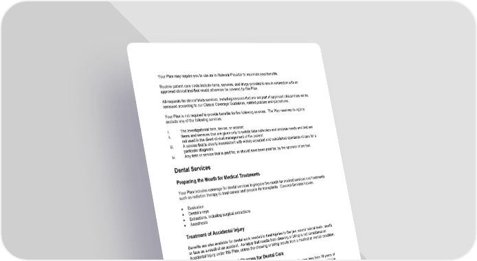 47 Your Plan may require you to use an In-Network Provider to maximize your benefits. Routine patient care costs include items, services, and drugs provided to you in connection with an approved clinical trial that would otherwise be covered by this Plan. All requests for clinical trials services, including services that are not part of approved clinical trials will be reviewed according to our Clinical Coverage Guidelines, related policies and procedures. Your Plan is not required to provide benefits for the following services. The Plan reserves its right to exclude any of the following services: i. The Investigational item, device, or service; ii. Items and services that are given only to satisfy data collection and analysis needs and that are not used in the direct clinical management of the patient; iii. A service that is clearly inconsistent with widely accepted and established standards of care for a particular diagnosis; iv. Any item or service that is paid for, or should have been paid for, by the sponsor of the trial Dental Services Preparing the Mouth for Medical Treatments Your Plan includes coverage for dental services to prepare the mouth for medical services and treatments such as radiation therapy to treat cancer and prepare for transplants. Covered Services include: • Evaluation • Dental x-rays • Extractions, including surgical extractions • Anesthesia Treatment of Accidental Injury Benefits are also available for dental work needed to treat injuries to the jaw, sound natural teeth, mouth or face as a result of an accident. An injury that results from chewing or biting is not considered an Accidental Injury under this Plan, unless the chewing or biting results from a medical or mental condition. Anesthesia and Hospital Charges for Dental Care Your Plan covers anesthesia and Hospital charges for dental care, for a Member less than 19 years of age or a Member who is physically or mentally disabled, if the Member requires dental treatment to be given in a Hospital or Outpatient Ambulatory Surgery Center. The Indications for General Anesthesia, as published in the reference manual of the American Academy of Pediatric Dentistry, should be used to determine whether performing dental procedures is necessary to treat the Member’s condition under general anesthesia. This coverage does not apply to treatment for temporal mandibular joint disorders (TMJ). Diabetes Equipment, Education, and Supplies Benefits include all Physician prescribed Medically Necessary equipment and supplies used for the management and treatment of diabetes. Screenings for gestational diabetes are covered under “Preventive Care.”