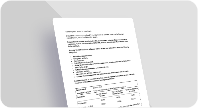 15 Claims Payment” section for more details. Deductibles, Coinsurance, and Benefit Period Maximums are calculated based upon the Maximum Allowed Amount, not the Provider’s billed charges. Essential Health Benefits provided within this Booklet are not subject to lifetime or annual dollar maximums. Certain non-essential health benefits, however, are subject to either a lifetime and/or dollar maximum. Essential Health Benefits are defined by federal law and refer to benefits in at least the following categories: • Ambulatory patient services, • Emergency services, • Hospitalization, • Maternity and newborn care, • Mental Health and Substance Use Disorder services, including behavioral health treatment, • Prescription drugs, • Rehabilitative and habilitative services and devices, • Laboratory services, • Preventive and wellness services, and • Chronic disease management and pediatric services, including oral and vision care. Such benefits shall be consistent with those set forth under the Patient Protection and Affordable Care Act of 2010 and any regulations issued pursuant thereto. Benefit Period Calendar Year Dependent Age Limit To the end of the month in which the child attains age 26. Deductible Tier 1 In-Network Providers Tier 2 All Other In- Network Providers Tier 3 Out-of-Network Providers Per Member $3,000 $6,000 $18,000 Per Family – All other Members combined $6,000 $12,000 $36,000 Note: The Tier 1 and Tier 2 Deductibles are combined and accumulate toward each other, but the Tier 3 Deductible is separate. When the Deductible applies, you must pay it before benefits begin. See the sections below to find out when the Deductible applies Copayments and Coinsurance are separate from and do not apply to the Deductible Coinsurance Tier 1 In-Network Providers Tier 2 All Other In-Network Providers Tier 3 Out-of-Network Providers Plan Pays 80% 60% 50%