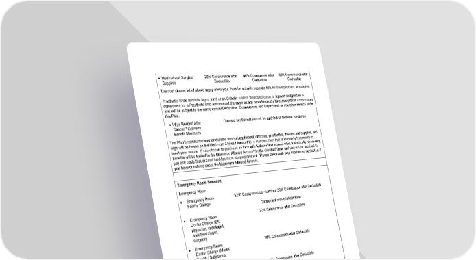 19 • Medical and Surgical Supplies 20% Coinsurance after Deductible 40% Coinsurance after Deductible 50% Coinsurance after Deductible The cost shares listed above apply when your Provider submits separate bills for the equipment or supplies. Prosthetic limbs (artificial leg or arm) or an Orthotic custom fabricated brace or support designed as a component for a Prosthetic limb are covered the same as any other Medically Necessary items and services and will be subject to the same annual Deductible, Coinsurance, and Copayment as any other service under this Plan. • Wigs Needed After Cancer Treatment Benefit Maximum One wig per Benefit Period. In- and Out-of-Network combined The Plan’s reimbursement for durable medical equipment, orthotics, prosthetics, devices and supplies, and wigs will be based on the Maximum Allowed Amount for a standard item that is Medically Necessary to meet your needs. If you choose to purchase an item with features that exceed what is Medically Necessary, benefits will be limited to the Maximum Allowed Amount for the standard item, and you will be required to pay any costs that exceed the Maximum Allowed Amount. Please check with your Provider or contact us if you have questions about the Maximum Allowed Amount. Emergency Room Services Emergency Room • Emergency Room Facility Charge $250 Copayment per visit then 20% Coinsurance after Deductible Copayment waived if admitted • Emergency Room Doctor Charge (ER physician, radiologist, anesthesiologist, surgeon) 20% Coinsurance after Deductible • Emergency Room Doctor Charge (Mental Health / Substance Use Disorder) 20% Coinsurance after Deductible • Other Facility Charges (including diagnostic x- ray and lab services, medical supplies) 20% Coinsurance after Deductible • Advanced Diagnostic Imaging (including MRIs, CAT scans) 20% Coinsurance after Deductible As described in the “Consolidated Appropriations Act of 2021 Notice” at the front of this Booklet, for Emergency Services, Out-of-Network Providers may only bill you for any applicable Copayments, Deductible and Coinsurance and may not bill you for any charges over the Plan’s Maximum Allowed Amount until the treating Out-of-Network Provider has determined you are stable and followed the notice and consent process. Please refer to the Notice at the beginning of this Booklet for more details. Habilitative Services Benefits are based on the setting in which Covered Services are received.