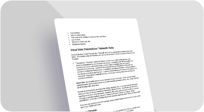 65 • X-ray services; • Care for broken bones; • Tests such as flu, urinalysis, pregnancy test, rapid strep; • Lab services; • Stitches for simple cuts; and • Draining an abscess. Virtual Visits (Telemedicine / Telehealth Visits) Covered Services include Telemedicine / Telehealth visits that are appropriately provided as described below. This includes visits with Providers who also provide services in person, as well as virtual care-only Providers. • “Telemedicine / Telehealth” means the delivery of health care or other health services using electronic communications and information technology, in compliance with HIPAA including: live (synchronous) secure videoconferencing or secure instant messaging; store and forward (asynchronous) technology. Covered Services provided through Telemedicine/ Telehealth are provided to facilitate the medical exams, consultations, and behavioral health, including substance use disorder evaluations and treatment. In-person contact between a Provider and the patient is not required for Telemedicine/ Telehealth services, and the type of setting where these services are provided is not limited. Please Note: Not all health services can be delivered through virtual visits. Certain services require equipment and/or direct physical hands-on care that cannot be provided remotely. Also, please note that not all Providers offer virtual visits. Benefits do not include the use of facsimile, texting, electronic mail, or non-secure instant messaging unless you have an already established relationship with the Provider. Benefits also do not include reporting normal lab or other test results, requesting office visits, getting answers to billing, insurance coverage or payment questions, asking for referrals to Providers outside our network, benefit precertification, or Provider to Provider discussions except as approved under “Office and Home Visits.” If you have any questions about this coverage, please contact Member Services at the number on the back of your Identification Card. Vision Services Benefits include medical and surgical treatment of injuries and illnesses of the eye. Certain vision screenings required by Federal law are covered under the “Preventive Care” benefit. Benefits do not include glasses or contact lenses except as listed in the “Prosthetics” benefit.