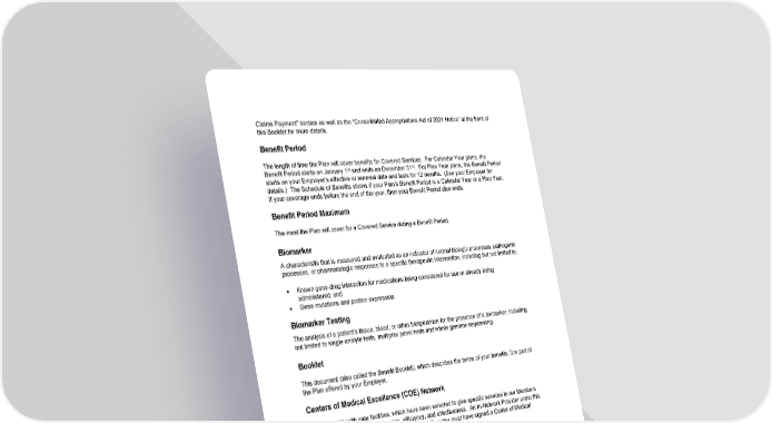 118 Claims Payment” section as well as the “Consolidated Appropriations Act of 2021 Notice” at the front of this Booklet for more details. Benefit Period The length of time the Plan will cover benefits for Covered Services. For Calendar Year plans, the Benefit Period starts on January 1st and ends on December 31st. For Plan Year plans, the Benefit Period starts on your Employer’s effective or renewal date and lasts for 12 months. (See your Employer for details.) The Schedule of Benefits shows if your Plan’s Benefit Period is a Calendar Year or a Plan Year. If your coverage ends before the end of the year, then your Benefit Period also ends. Benefit Period Maximum The most the Plan will cover for a Covered Service during a Benefit Period. Biomarker A characteristic that is measured and evaluated as an indicator of normal biologic processes, pathogenic processes, or pharmacologic responses to a specific therapeutic intervention, including but not limited to: • Known gene-drug interaction for medications being considered for use or already being administered; and • Gene mutations and protein expression. Biomarker Testing The analysis of a patient’s tissue, blood, or other biospecimen for the presence of a biomarker, including not limited to single-analyte tests, multiplex panel tests and whole genome sequencing. Booklet This document (also called the Benefit Booklet), which describes the terms of your benefits. It is part of the Plan offered by your Employer. Centers of Medical Excellence (COE) Network A network of health care facilities, which have been selected to give specific services to our Members based on their experience, outcomes, efficiency, and effectiveness. An In-Network Provider under this Plan is not necessarily a COE. To be a COE, the Provider must have signed a Center of Medical Excellence Agreement with us. Claims Administrator The company the Employer chose to administer its health benefits. Anthem Insurance Companies, Inc., dba Anthem Blue Cross and Blue Shield was chosen to administer this Plan. The Claims Administrator provides administrative claims payment services only and does not assume any financial risk or obligation with respect to claims. Coinsurance Your share of the cost for Covered Services, which is a percent of the Maximum Allowed Amount. You normally pay Coinsurance after you meet your Deductible. For example, if your Plan lists 20% Coinsurance on office visits, and the Maximum Allowed Amount is $100, your Coinsurance would be $20 after you meet the Deductible. The Plan would then cover the rest of the Maximum Allowed Amount.
