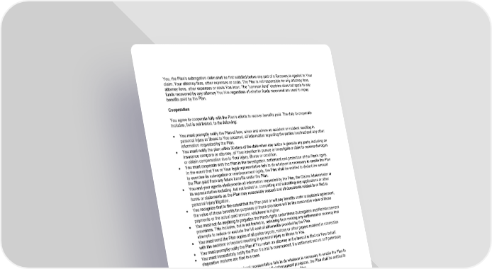 91 You, the Plan's subrogation claim shall be first satisfied before any part of a Recovery is applied to Your claim, Your attorney fees, other expenses or costs. The Plan is not responsible for any attorney fees, attorney liens, other expenses or costs You incur. The ''common fund'' doctrine does not apply to any funds recovered by any attorney You hire regardless of whether funds recovered are used to repay benefits paid by the Plan. Cooperation You agree to cooperate fully with the Plan’s efforts to recover benefits paid. The duty to cooperate includes, but is not limited, to the following: • You must promptly notify the Plan of how, when and where an accident or incident resulting in personal injury or illness to You occurred, all information regarding the parties involved and any other information requested by the Plan. • You must notify the plan within 30 days of the date when any notice is given to any party, including an insurance company or attorney, of Your intention to pursue or investigate a claim to recover damages or obtain compensation due to Your injury, illness or condition. • You must cooperate with the Plan in the investigation, settlement and protection of the Plan's rights. In the event that You or Your legal representative fails to do whatever is necessary to enable the Plan to exercise its subrogation or reimbursement rights, the Plan shall be entitled to deduct the amount the Plan paid from any future benefits under the Plan. • You and your agents shall provide all information requested by the Plan, the Claims Administrator or its representative including, but not limited to, completing and submitting any applications or other forms or statements as the Plan may reasonably request and all documents related to or filed in personal injury litigation. • You recognize that to the extent that the Plan paid or will pay benefits under a capitated agreement, the value of those benefits for purposes of these provisions will be the reasonable value of those payments or the actual paid amount, whichever is higher. • You must not do anything to prejudice the Plan's rights under these Subrogation and Reimbursement provisions. This includes, but is not limited to, refraining from making any settlement or recovery that attempts to reduce or exclude the full cost of all benefits provided by the Plan. • You must send the Plan copies of all police reports, notices or other papers received in connection with the accident or incident resulting in personal injury or illness to You. • You must promptly notify the Plan if You retain an attorney or if a lawsuit is filed on Your behalf. • You must immediately notify the Plan if a trial is commenced, if a settlement occurs or if potentially dispositive motions are filed in a case. In the event that You or Your legal representative fails to do whatever is necessary to enable the Plan to exercise its rights under these Subrogation and Reimbursement provisions, the Plan shall be entitled to deduct the amount the Plan paid from any future benefits under the Plan. If You fail to repay the Plan, the Plan shall be entitled to deduct any of the unsatisfied portion of the amount of benefits the Plan has paid or the amount of Your Recovery whichever is less, from any future benefit under the Plan if: The amount the Plan paid on Your behalf is not repaid or otherwise recovered by the Plan; or You fail to cooperate. In the event You fail to disclose the amount of Your settlement to the Plan, the Plan shall be entitled to deduct the amount of the Plan’s lien from any future benefit under the Plan. The Plan shall also be entitled to recover any of the unsatisfied portion of the amount the Plan has paid or the amount of Your Recovery, whichever is less, directly from the Providers to whom the Plan has made payments on Your behalf. In such a circumstance, it may then be Your obligation to pay the Provider the full billed amount, and the Plan will not have any obligation to pay the Provider or reimburse You.