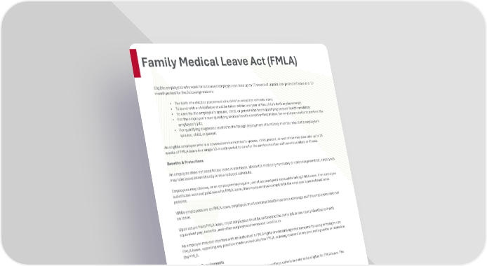 Page 21 | Ball State University | Plan Year 2026 This compliance overview is not intended to be exhaustive nor should any discussion or opinions be construed as legal advice. Readers should contact legal counsel for legal advice. Family Medical Leave Act (FMLA) Eligible employees who work for a covered employer can take up to 12 weeks of unpaid, job-protected leave in a 12- month period for the following reasons: • The birth of a child or placement of a child for adoption or foster care; • To bond with a child (leave must be taken within one year of the child’s birth or placement); • To care for the employee’s spouse, child, or parent who has a qualifying serious health condition; • For the employee’s own qualifying serious health condition that makes the employee unable to perform the employee’s job; • For qualifying exigencies related to the foreign deployment of a military member who is the employee’s spouse, child, or parent. An eligible employee who is a covered servicemember’s spouse, child, parent, or next of kin may also take up to 26 weeks of FMLA leave in a single 12-month period to care for the servicemember with a serious injury or illness. Benefits & Protections An employee does not need to use leave in one block. When it is medically necessary or otherwise permitted, employees may take leave intermittently or on a reduced schedule. Employees may choose, or an employer may require, use of accrued paid leave while taking FMLA leave. If an employee substitutes accrued paid leave for FMLA leave, the employee must comply with the employer’s normal paid leave policies. While employees are on FMLA leave, employers must continue health insurance coverage as if the employees were not on leave. Upon return from FMLA leave, most employees must be restored to the same job or one nearly identical to it with equivalent pay, benefits, and other employment terms and conditions. An employer may not interfere with an individual’s FMLA rights or retaliate against someone for using or trying to use FMLA leave, opposing any practice made unlawful by the FMLA, or being involved in any proceeding under or related to the FMLA. Eligibility Requirements An employee who works for a covered employer must meet three criteria in order to be eligible for FMLA leave. The employee must: • Have worked for the employer for at least 12 months; • Have at least 1,250 hours of service in the 12 months before taking leave;* and • Work at a location where the employer has at least 50 employees within 75 miles of the employee’s worksite. *Special “hours of service” requirements apply to airline flight crew employees.