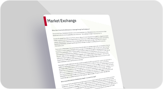 Page 26 | Ball State University | Plan Year 2026 This compliance overview is not intended to be exhaustive nor should any discussion or opinions be construed as legal advice. Readers should contact legal counsel for legal advice. Market Exchange When Can I Enroll in Health Insurance Coverage through the Marketplace? You can enroll in a Marketplace health insurance plan during the annual Marketplace Open Enrollment Period. Open Enrollment varies by state but generally starts November 1 and continues through at least December 15. Outside the annual Open Enrollment Period, you can sign up for health insurance if you qualify for a Special Enrollment Period. In general, you qualify for a Special Enrollment Period if you’ve had certain qualifying life events, such as getting married, having a baby, adopting a child, or losing eligibility for other health coverage. Depending on your Special Enrollment Period type, you may have 60 days before or 60 days following the qualifying life event to enroll in a Marketplace plan. There is also a Marketplace Special Enrollment Period for individuals and their families who lose eligibility for Medicaid or Children’s Health Insurance Program (CHIP) coverage on or after March 31, 2023, through July 31, 2024. Since the onset of the nationwide COVID-19 public health emergency, state Medicaid and CHIP agencies generally have not terminated the enrollment of any Medicaid or CHIP beneficiary who was enrolled on or after March 18, 2020, through March 31, 2023. As state Medicaid and CHIP agencies resume regular eligibility and enrollment practices, many individuals may no longer be eligible for Medicaid or CHIP coverage starting as early as March 31, 2023. The U.S. Department of Health and Human Services is offering a temporary Marketplace Special Enrollment period to allow these individuals to enroll in Marketplace coverage. Marketplace-eligible individuals who live in states served by HealthCare.gov and either- submit a new application or update an existing application on HealthCare.gov between March 31, 2023 and July 31, 2024, and attest to a termination date of Medicaid or CHIP coverage within the same time period, are eligible for a 60-day Special Enrollment Period. That means that if you lose Medicaid or CHIP coverage between March 31, 2023, and July 31, 2024, you may be able to enroll in Marketplace coverage within 60 days of when you lost Medicaid or CHIP coverage. In addition, if you or your family members are enrolled in Medicaid or CHIP coverage, it is important to make sure that your contact information is up to date to make sure you get any information about changes to your eligibility. To learn more, visit HealthCare.gov or call the Marketplace Call Center at 1-800-318-2596. TTY users can call 1-855-889-4325. What about Alternatives to Marketplace Health Insurance Coverage? If you or your family are eligible for coverage in an employment-based health plan (such as an employer-sponsored health plan), you or your family may also be eligible for a Special Enrollment Period to enroll in that health plan in certain circumstances, including if you or your dependents were enrolled in Medicaid or CHIP coverage and lost that coverage. Generally, you have 60 days after the loss of Medicaid or CHIP coverage to enroll in an employment-based health plan, but if you and your family lost eligibility for Medicaid or CHIP coverage between March 31, 2023 and July 10, 2023, you can request this special enrollment in the employment-based health plan through September 8, 2023. Confirm the deadline with your employer or your employment-based health plan. Alternatively, you can enroll in Medicaid or CHIP coverage at any time by filling out an application through the Marketplace or applying directly through your state Medicaid agency. Visit https://www.healthcare.gov/medicaid- chip/getting-medicaid-chip/ for more details. How Can I Get More Information? For more information about your coverage offered through your employment, please check your health plan’s summary plan description or contact. The Marketplace can help you evaluate your coverage options, including your eligibility for coverage through the Marketplace and its cost. Please visit HealthCare.gov for more information, including an online application for health insurance coverage and contact information for a Health Insurance Marketplace in your area.
