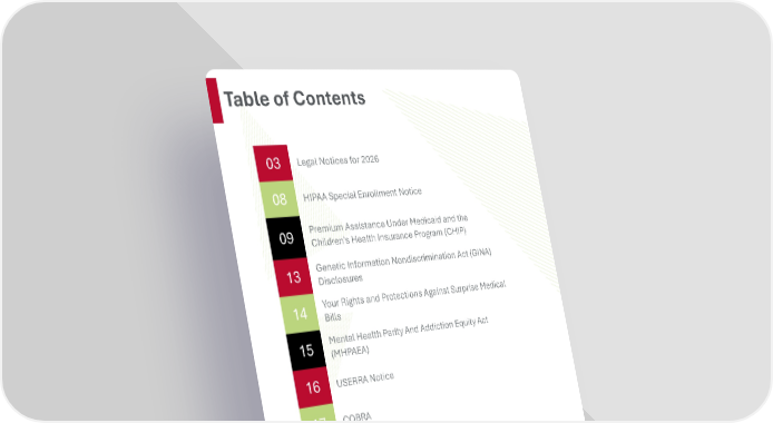 Page 2 | Ball State University | Plan Year 2026 This compliance overview is not intended to be exhaustive nor should any discussion or opinions be construed as legal advice. Readers should contact legal counsel for legal advice. 03 Legal Notices for 2026 08 HIPAA Special Enrollment Notice 09 Premium Assistance Under Medicaid and the Children’s Health Insurance Program (CHIP) 13 Genetic Information Nondiscrimination Act (GINA) Disclosures 14 Your Rights and Protections Against Surprise Medical Bills 15 Mental Health Parity And Addiction Equity Act (MHPAEA) 16 USERRA Notice 17 COBRA 21 Family Medical Leave Act (FMLA) 23 Medicare Part D Creditable 25 Market Exchange 29 Notices Regarding Wellness Program & Tobacco Cessation Table of Contents