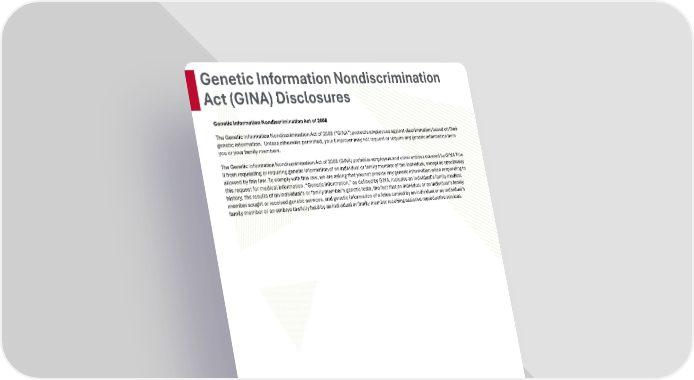Page 13 | Ball State University | Plan Year 2026 This compliance overview is not intended to be exhaustive nor should any discussion or opinions be construed as legal advice. Readers should contact legal counsel for legal advice. Genetic Information Nondiscrimination Act of 2008 The Genetic Information Nondiscrimination Act of 2008 (“GINA”) protects employees against discrimination based on their genetic information. Unless otherwise permitted, your Employer may not request or require any genetic information from you or your family members. The Genetic Information Nondiscrimination Act of 2008 (GINA) prohibits employers and other entities covered by GINA Title II from requesting or requiring genetic information of an individual or family member of the individual, except as specifically allowed by this law. To comply with this law, we are asking that you not provide any genetic information when responding to this request for medical information. “Genetic information,” as defined by GINA, includes an individual’s family medical history, the results of an individual’s or family member’s genetic tests, the fact that an individual or an individual’s family member sought or received genetic services, and genetic information of a fetus carried by an individual or an individual’s family member or an embryo lawfully held by an individual or family member receiving assistive reproductive services. Genetic Information Nondiscrimination Act (GINA) Disclosures