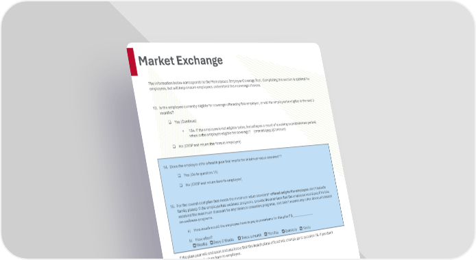 Page 28 | Ball State University | Plan Year 2026 This compliance overview is not intended to be exhaustive nor should any discussion or opinions be construed as legal advice. Readers should contact legal counsel for legal advice. Market Exchange The information below corresponds to the Marketplace Employer Coverage Tool. Completing this section is optional for employers, but will help ensure employees understand their coverage choices. 13. Is the employee currently eligible for coverage offered by this employer, or will the employee be eligible in the next 3 months? Yes (Continue) • 13a. If the employee is not eligible today, including as a result of a waiting or probationary period, when is the employee eligible for coverage? (mm/dd/yyyy) (Continue) No (STOP and return this form to employee) 14. Does the employer offer a health plan that meets the minimum value standard*? Yes (Go to question 15) No (STOP and return form to employee) 15. For the lowest-cost plan that meets the minimum value standard* offered only to the employee (don't include family plans): If the employer has wellness programs, provide the premium that the employee would pay if he/she received the maximum discount for any tobacco cessation programs, and didn't receive any other discounts based on wellness programs. a) How much would the employee have to pay in premiums for this plan? $_______________ b) How often? Weekly Every 2 Weeks Twice a month Monthly Quarterly Yearly If the plan year will end soon and you know that the health plans offered will change, go to question 16. If you don't know, STOP and return form to employee. 16. What change will the employer make for the new plan year? Employer won't offer health coverage Employer will start offering health coverage to employees or change the premium for the lowest-cost plan available only to the employee that meets the minimum value standard.* (Premium should reflect the discount for wellness programs. See question 15.) a) How much would the employee have to pay in premiums for this plan? $_______________ b) How often? Weekly Every 2 Weeks Twice a month Monthly Quarterly Yearly * An employer-sponsored health plan meets the "minimum value standard" if the plan's share of the total allowed benefit costs covered by the plan is no less than 60 percent of such costs (Section 36B(c)(2)(C)(ii) of the Internal Revenue Code of 1986)