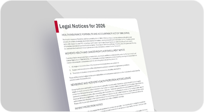 Page 3 | Ball State University | Plan Year 2026 This compliance overview is not intended to be exhaustive nor should any discussion or opinions be construed as legal advice. Readers should contact legal counsel for legal advice. Legal Notices for 2026 HEALTH INSURANCE PORTABILITY AND ACCOUNTABILITY ACT OF 1996 (HIPAA) The Health Insurance Portability and Accountability Act of 1996 (HIPAA) is a federal law that addresses the privacy and security of certain individually identifiable health information, called protected health information (or PHI). You have certain rights with respect to your PHI, including a right to see or get a copy of your health and claims records and other health information maintained by a health plan or carrier. For a copy of the Notice of Privacy Practices, describing how your PHI may be used and disclosed and how you get access to the information, contact Human Resources. WOMEN’S HEALTH AND CANCER RIGHTS ACT ENROLLMENT NOTICE If you have had or are going to have a mastectomy, you may be entitled to certain benefits under the Woman’s Health and Cancer Rights Act of 1998 (WHCRA). For individuals receiving mastectomy-related benefits, coverage will be provided in a manner determined in consultation with the attending physician and the patient, for: 1. All stages of reconstruction of the breast on which mastectomy was performed. 2. Surgery and reconstruction of the other breast to produce a symmetrical appearance; prostheses. 3. Treatment of physical complications of the mastectomy, including lymphedema. These will be provided subject to the same deductibles and coinsurance applicable to other medical and surgical benefits provided under this benefits plan. NEWBORNS’ AND MOTHERS’ HEALTH PROTECTION ACT DISCLOSURE Group health plans and health insurance issuers generally may not, under Federal law, restrict benefits for any hospital length of stay in connection with childbirth for the mother or newborn child to less than 48 hours following a vaginal delivery, or less than 96 hours following a cesarean section. However, Federal law generally does not prohibit the mother’s or newborn’s attending provider, after consulting with the mother, from discharging the mother or her newborn earlier than 48 hours (or 96 hours as applicable). In any case, plans and issuers may not, under Federal law, require that a provider obtain authorization from the plan or the insurance issuer for prescribing a length of stay not in excess of 48 hours (or 96 hours). Please refer to your plan document for more information about childbirth coverage. PATIENT PROTECTION NOTICE Your carrier generally may require the designation of a primary care provider. You have the right to designate any primary care provider who participates in your network and who is available to accept you or your family members. Until you make this designation, your carrier may designate one for you. For children, you may designate a pediatrician as the primary care provider. You do not need prior authorization from your carrier or from any other person (including a primary care provider) in order to obtain access to obstetrical or gynecological care from a health care professional in your network who specializes in obstetrics or gynecology. The health care professional, however, may be required to comply with certain procedures, including obtaining prior authorization for certain services, following a pre-approved treatment plan, or procedures for making referrals. For information on how to select a primary care provider, a list of the participating primary care providers, or a list of participating health care professionals who specialize in obstetrics or gynecology, contact your plan administrator using the number on the back of your ID card.