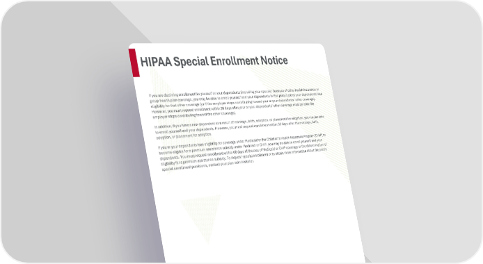 Page 8 | Ball State University | Plan Year 2026 This compliance overview is not intended to be exhaustive nor should any discussion or opinions be construed as legal advice. Readers should contact legal counsel for legal advice. HIPAA Special Enrollment Notice If you are declining enrollment for yourself or your dependents (including your spouse) because of other health insurance or group health plan coverage, you may be able to enroll yourself and your dependents in this plan if you or your dependents lose eligibility for that other coverage (or if the employer stops contributing toward your or your dependents’ other coverage). However, you must request enrollment within 30 days after your or your dependents’ other coverage ends (or after the employer stops contributing toward the other coverage). In addition, if you have a new dependent as a result of marriage, birth, adoption, or placement for adoption, you may be able to enroll yourself and your dependents. However, you must request enrollment within 30 days after the marriage, birth, adoption, or placement for adoption. If you or your dependents lose eligibility for coverage under Medicaid or the Children’s Health Insurance Program (CHIP) or become eligible for a premium assistance subsidy under Medicaid or CHIP, you may be able to enroll yourself and your dependents. You must request enrollment within 60 days of the loss of Medicaid or CHIP coverage or the determination of eligibility for a premium assistance subsidy. To request special enrollment or to obtain more information about the plan's special enrollment provisions, contact your plan administrator.