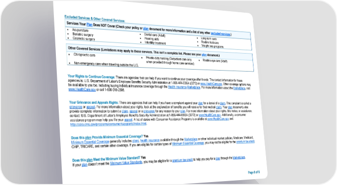 Excluded Services & Other Covered Services: Services Your Plan Does NOT Cover (Check your policy or plan document for more information and a list of any other excluded services.) • Acupuncture • Dental care (Adult) • Long-term care • Bariatric surgery • Hearing aids • Routine foot care • Cosmetic surgery • Infertility treatment • Weight loss programs Other Covered Services (Limitations may apply to these services. This isn’t a complete list. Please see your plan document.) • Chiropractic care • Private-duty nursing (Outpatient care only • Routine eye care (Adult) when provided through home care services) • Non-emergency care when traveling outside the U.S. Your Rights to Continue Coverage: There are agencies that can help if you want to continue your coverage after it ends. The contact information for those agencies is: U.S. Department of Labor's Employee Benefits Security Administration at 1-866-444-EBSA (3272) or www.HealthCare.gov. Other coverage options may be available to you too, including buying individual insurance coverage through the Health Insurance Marketplace. For more information about the Marketplace, visit www.HealthCare.gov or call 1-800-318-2596. Your Grievance and Appeals Rights: There are agencies that can help if you have a complaint against your plan for a denial of a claim. This complaint is called a grievance or appeal. For more information about your rights, look at the explanation of benefits you will receive for that medical claim. Your plan documents also provide complete information to submit a claim, appeal or a grievance for any reason to your plan. For more information about your rights, this notice, or assistance, contact: U.S. Department of Labor's Employee Benefits Security Administration at 1-866-444-EBSA (3272) or www.HealthCare.gov. Additionally, a consumer assistance program may help you file your appeal. A list of states with Consumer Assistance Programs is available at www.HealthCare.gov and http://cciio.cms.gov/programs/consumer/capgrants/index.html. Does this plan Provide Minimum Essential Coverage? Yes Minimum Essential Coverage generally includes plans, health insurance available through the Marketplace or other individual market policies, Medicare, Medicaid, CHIP, TRICARE, and certain other coverage. If you are eligible for certain types of Minimum Essential Coverage, you may not be eligible for the premium tax credit. Does this plan Meet the Minimum Value Standard? Yes If your plan doesn’t meet the Minimum Value Standards, you may be eligible for a premium tax credit to help you pay for a plan through the Marketplace. Page 6 of 8
