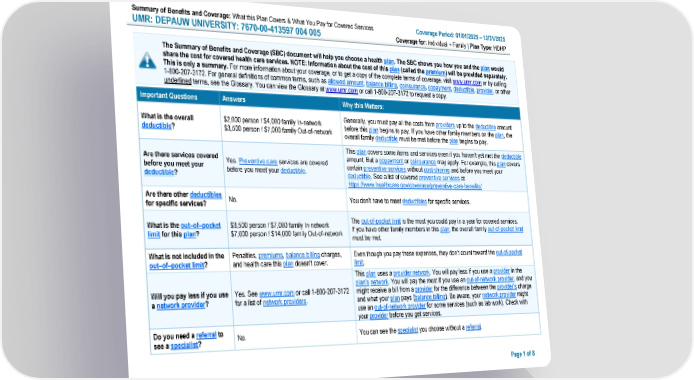 Summary of Benefits and Coverage: What this Plan Covers & What You Pay for Covered Services Coverage Period: 01/01/2025 – 12/31/2025 UMR: DEPAUW UNIVERSITY: 7670-00-413597 004 005 Coverage for: Individual + Family | Plan Type: HDHP The Summary of Benefits and Coverage (SBC) document will help you choose a health plan. The SBC shows you how you and the plan would share the cost for covered health care services. NOTE: Information about the cost of this plan (called the premium) will be provided separately. This is only a summary. For more information about your coverage, or to get a copy of the complete terms of coverage, visit www.umr.com or by calling 1-800-207-3172. For general definitions of common terms, such as allowed amount, balance billing, coinsurance, copayment, deductible, provider, or other underlined terms, see the Glossary. You can view the Glossary at www.umr.com or call 1-800-207-3172 to request a copy. Important Questions Answers Why this Matters: What is the overall $2,000 person / $4,000 family In-network Generally, you must pay all the costs from providers up to the deductible amount deductible? $3,500 person / $7,000 family Out-of-network before this plan begins to pay. If you have other family members on the plan, the overall family deductible must be met before the plan begins to pay. This plan covers some items and services even if you haven’t yet met the deductible Are there services covered Yes. Preventive care services are covered amount. But a copayment or coinsurance may apply. For example, this plan covers before you meet your before you meet your deductible. certain preventive services without cost-sharing and before you meet your deductible? deductible. See a list of covered preventive services at https://www.healthcare.gov/coverage/preventive-care-benefits/ Are there other deductibles No. You don’t have to meet deductibles for specific services. for specific services? What is the out–of–pocket $3,500 person / $7,000 family In-network The out-of-pocket limit is the most you could pay in a year for covered services. limit for this plan? $7,000 person / $14,000 family Out-of-network If you have other family members in this plan, the overall family out-of-pocket limit must be met. What is not included in the Penalties, premiums, balance billing charges, Even though you pay these expenses, they don’t count toward the out-of-pocket out–of–pocket limit? and health care this plan doesn’t cover. limit. This plan uses a provider network. You will pay less if you use a provider in the plan’s network. You will pay the most if you use an out-of-network provider, and you Will you pay less if you use Yes. See www.umr.com or call 1-800-207-3172 might receive a bill from a provider for the difference between the provider’s charge a network provider? for a list of network providers. and what your plan pays (balance billing). Be aware, your network provider might use an out-of-network provider for some services (such as lab work). Check with your provider before you get services. Do you need a referral to No. You can see the specialist you choose without a referral. see a specialist? Page 1 of 8