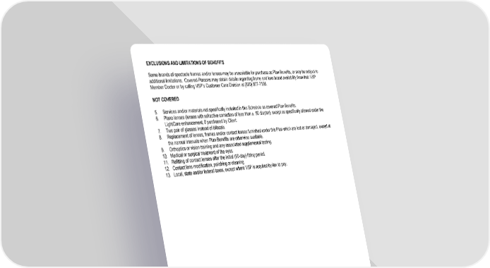EXCLUSIONS AND LIMITATIONS OF BENEFITS Some brands of spectacle frames and/or lenses may be unavailable for purchase as Plan Benefits, or may be subject to additional limitations. Covered Persons may obtain details regarding frame and lens brand availability from their VSP Member Doctor or by calling VSP’s Customer Care Division at (800) 877-7195. NOT COVERED 5. Services and/or materials not specifically included in this Schedule as covered Plan Benefits. 6. Plano lenses (lenses with refractive correction of less than ± .50 diopter), except as specifically allowed under the LightCare enhancement, if purchased by Client. 7. Two pair of glasses instead of bifocals. 8. Replacement of lenses, frames and/or contact lenses furnished under this Plan which are lost or damaged, except at the normal intervals when Plan Benefits are otherwise available. 9. Orthoptics or vision training and any associated supplemental testing. 10. Medical or surgical treatment of the eyes. 11. Refitting of contact lenses after the initial (90-day) fitting period. 12. Contact lens modification, polishing or cleaning. 13. Local, state and/or federal taxes, except where VSP is required by law to pay. 15
