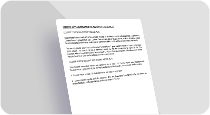 OBTAINING SUPPLEMENTAL ESSENTIAL MEDICAL EYE CARE SERVICES COVERED PERSON HAS A GROUP MEDICAL PLAN Supplemental Essential Medical Eye Care provides coverage for certain vision-related medical services as a supplement to Covered Person’s group medical plan. Covered Persons should refer to the plan booklet, certificate of coverage or other benefits description for their group medical plan to determine available benefits and how to obtain medical plan benefits. The eye care provider should first submit a claim to Covered Person’s group medical plan when participating in the medical plan’s network. Any amounts not paid by the primary medical plan may then be considered for payment by VSP. This process is referred to as Coordination of Benefits (“COB."). Please refer to the Coordination of Benefits section of Covered Person’s Evidence of Coverage for additional information regarding COB. COVERED PERSON DOES NOT HAVE A GROUP MEDICAL PLAN When Covered Person does not have a group medical plan, or when a VSP Preferred Provider does not participate with Covered Person’s group medical plan, the Supplemental Essential Medical Eye Care provides plan benefits as follows: 1. Covered Person contacts VSP Preferred Provider and makes an appointment. 2. Covered Person pays the applicable Copayment at the time Supplemental Essential Medical Eye Care services are rendered and amounts for any additional services not covered by the Plan. 19