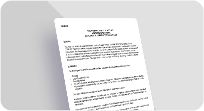 EXHIBIT C VISION SERVICE PLAN OF ILLINOIS, NFP ADDITIONAL BENEFIT RIDER SUPPLEMENTAL ESSENTIAL MEDICAL EYE CARE GENERAL This Rider lists additional vision care benefits to which Covered Persons of VISION SERVICE PLAN INSURANCE COMPANY (“VSP”) are entitled, subject to any applicable Copayments and other conditions, limitations and/or exclusions stated herein. The Supplemental Essential Medical Eye Care benefit is designed for the detection, treatment and management of ocular conditions and/or systemic conditions which produce ocular or visual symptoms. Under the benefit, eye care professionals provide treatment and services for urgent ocular emergencies as well as the management of chronic systemic diseases that manifest in the eyes. This Rider forms a part of the Policy and Evidence of Coverage to which it is attached. ELIGIBILITY The following are Covered Persons under this Plan, pursuant to eligibility criteria established by Client: • Enrollee • Legal Spouse of Enrollee • Domestic Partner • Any child of Enrollee, including a natural child from date of birth, child of a civil union legally adopted child from the date of placement for adoption with the Enrollee, or other child for whom a court or administrative agency holds the Enrollee responsible. Dependent children are covered up to the end of the month in which they turn age 26. A dependent unmarried child over the limiting age may continue to be eligible as a dependent if the child is incapable of self-sustaining employment because of mental or physical disability, and chiefly dependent upon Enrollee for support and maintenance. Essential Medical Eye Care benefits are available to Covered Persons only after covered benefits under their group medical plan have been exhausted, or when Covered Person is not covered under a group medical plan. Covered benefits include specific medical eye care procedure codes when appropriate for the optometric scope of licensure as well as the current laws, rules and regulations as determined by the State and Federal Government. 18