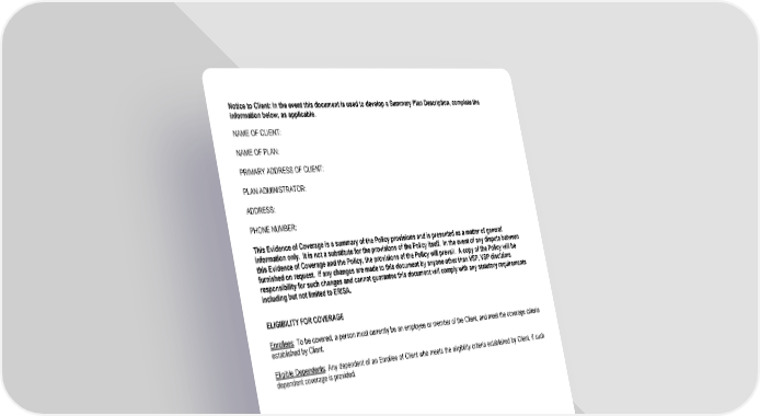 Notice to Client: In the event this document is used to develop a Summary Plan Description, complete the information below, as applicable. NAME OF CLIENT: NAME OF PLAN: PRIMARY ADDRESS OF CLIENT: PLAN ADMINISTRATOR: ADDRESS: PHONE NUMBER: This Evidence of Coverage is a summary of the Policy provisions and is presented as a matter of general information only. It is not a substitute for the provisions of the Policy itself. In the event of any dispute between this Evidence of Coverage and the Policy, the provisions of the Policy will prevail. A copy of the Policy will be furnished on request. If any changes are made to this document by anyone other than VSP, VSP disclaims responsibility for such changes and cannot guarantee this document will comply with any statutory requirements including but not limited to ERISA. ELIGIBILITY FOR COVERAGE Enrollees: To be covered, a person must currently be an employee or member of the Client, and meet the coverage criteria established by Client. Eligible Dependents: Any dependent of an Enrollee of Client who meets the eligibility criteria established by Client, if such dependent coverage is provided. 1