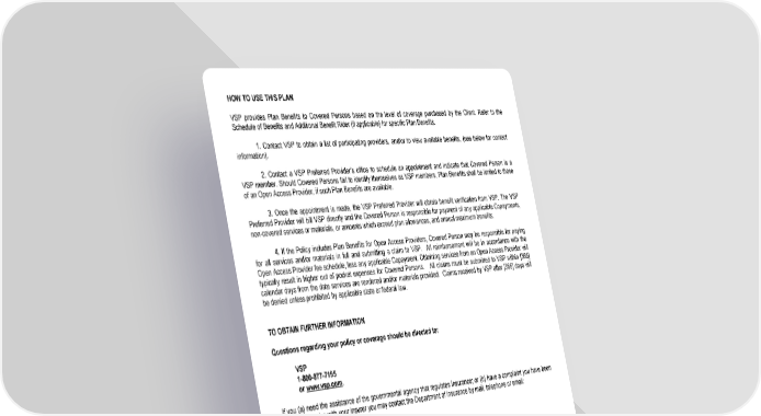 HOW TO USE THIS PLAN VSP provides Plan Benefits to Covered Persons based on the level of coverage purchased by the Client. Refer to the Schedule of Benefits and Additional Benefit Rider (if applicable) for specific Plan Benefits. 1. Contact VSP to obtain a list of participating providers, and/or to view available benefits, (see below for contact information). 2. Contact a VSP Preferred Provider’s office to schedule an appointment and indicate that Covered Person is a VSP member. Should Covered Persons fail to identify themselves as VSP members, Plan Benefits shall be limited to those of an Open Access Provider, if such Plan Benefits are available. 3. Once the appointment is made, the VSP Preferred Provider will obtain benefit verification from VSP. The VSP Preferred Provider will bill VSP directly and the Covered Person is responsible for payment of any applicable Copayments, non-covered services or materials, or amounts which exceed plan allowances, and annual maximum benefits. 4. If the Policy includes Plan Benefits for Open Access Providers, Covered Person may be responsible for paying for all services and/or materials in full and submitting a claim to VSP. All reimbursement will be in accordance with the Open Access Provider fee schedule, less any applicable Copayment. Obtaining services from an Open Access Provider will typically result in higher out of pocket expenses for Covered Persons. All claims must be submitted to VSP within [365] calendar days from the date services are rendered and/or materials provided. Claims received by VSP after [365] days will be denied unless prohibited by applicable state or federal law. TO OBTAIN FURTHER INFORMATION Questions regarding your policy or coverage should be directed to: VSP 1-800-877-7195 or www.vsp.com. If you (a) need the assistance of the governmental agency that regulates insurance; or (b) have a complaint you have been unable to resolve with your insurer you may contact the Department of Insurance by mail, telephone or email: State of Indiana Department of Insurance Consumer Services Division 311 West Washington Street, Suite 300 Indianapolis, Indiana 46204 Consumer Hotline: (800) 622-4461; (317) 232-2395 Complaints can be filed electronically at www.in.gov/idoi. 2