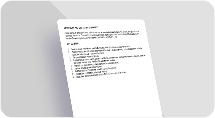 EXCLUSIONS AND LIMITATIONS OF BENEFITS Some brands of spectacle frames and/or lenses may be unavailable for purchase as Plan Benefits or may be subject to additional limitations. Covered Persons may obtain details regarding frame and lens brand availability from their VSP Member Doctor or by calling VSP’s Customer Care Division at (800) 877-7195. NOT COVERED 1. Services and/or materials not specifically included in this Schedule as covered Plan Benefits. 2. Plano lenses (lenses with refractive correction of less than ± .50 diopter), except as specifically allowed under the LightCare enhancement, if purchased by Client. 3. Two pair of glasses instead of bifocals. 4. Replacement of lenses, frames and/or contact lenses furnished under this Plan which are lost or damaged, except at the normal intervals when Plan Benefits are otherwise available. 5. Orthoptics or vision training and any associated supplemental testing. 6. Medical or surgical treatment of the eyes. 7. Refitting of contact lenses after the initial (90-day) fitting period. 8. Contact lens modification, polishing or cleaning. 9. Local, state and/or federal taxes, except where VSP is required by law to pay. 9