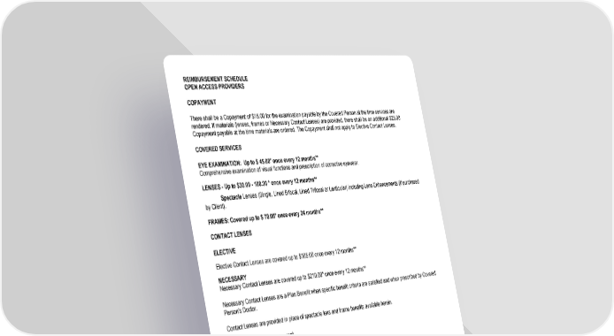 REIMBURSEMENT SCHEDULE OPEN ACCESS PROVIDERS COPAYMENT There shall be a Copayment of $15.00 for the examination payable by the Covered Person at the time services are rendered. If materials (lenses, frames or Necessary Contact Lenses) are provided, there shall be an additional $25.00 Copayment payable at the time materials are ordered. The Copayment shall not apply to Elective Contact Lenses. COVERED SERVICES EYE EXAMINATION: Up to $ 45.00* once every 12 months** Comprehensive examination of visual functions and prescription of corrective eyewear. LENSES - Up to $30.00 - 100.00 * once every 12 months** Spectacle Lenses (Single, Lined Bifocal, Lined Trifocal or Lenticular) including Lens Enhancements (if purchased by Client). FRAMES: Covered up to $ 70.00* once every 24 months** CONTACT LENSES ELECTIVE Elective Contact Lenses are covered up to $105.00 once every 12 months** NECESSARY Necessary Contact Lenses are covered up to $210.00* once every 12 months** Necessary Contact Lenses are a Plan Benefit when specific benefit criteria are satisfied and when prescribed by Covered Person's Doctor. Contact Lenses are provided in place of spectacle lens and frame benefits available herein. *Less any applicable Copayment. **beginning with the first day of the Benefit Period. 10