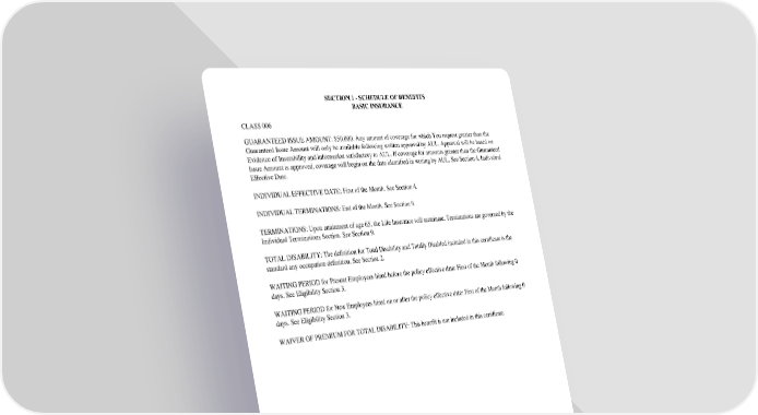 SECTION1-SCHEDULEOFBENEFITS BASICINSURANCE CLASS006 GUARANTEEDISSUEAMOUNT:$50,000.AnyamountofcoverageforwhichYourequestgreaterthanthe Guaranteed Issue Amount will only be available following written approval by AUL. Approval will be based on Evidence of Insurability and information satisfactory to AUL. If coverage for amounts greater than the Guaranteed Issue Amount is approved, coverage will begin on the date identified in writing by AUL. See Section 4, Individual Effective Date. INDIVIDUALEFFECTIVEDATE:FirstoftheMonth.SeeSection4. INDIVIDUALTERMINATIONS:EndoftheMonth.SeeSection9. TERMINATIONS:Uponattainmentofage65,theLifeInsurancewillterminate.Terminationsaregovernedby the Individual Terminations Section. See Section 9. TOTALDISABILITY:ThedefinitionforTotalDisabilityandTotallyDisabledincludedin this certificateis the standard any occupation definition. See Section 2. WAITINGPERIODforPresentEmployeeshiredbeforethepolicyeffectivedate:Firstof the Month following 0 days. See Eligibility Section 3. WAITINGPERIODforNewEmployeeshiredonorafterthepolicyeffectivedate:FirstoftheMonthfollowing0 days. See Eligibility Section 3. WAIVEROFPREMIUMFORTOTALDISABILITY:Thisbenefitisnotincludedinthiscertificate. GC2510.2 SECTION1-SCHEDULEOFBENEFITS