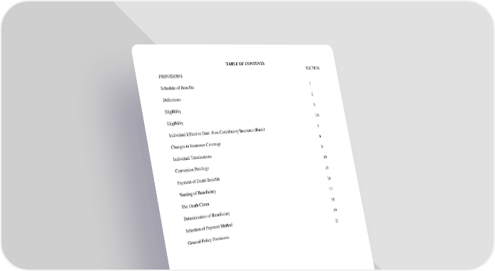TABLEOFCONTENTS SECTION PROVISIONS Schedule of Benefits 1 Definitions 2 Eligibility 3 Eligibility 3A Individual Effective Date--Non-Contributory Insurance (Basic) 4 Changesin Insurance Coverage 6 Individual Terminations 9 Conversion Privilege 10 PaymentofDeathBenefits 15 NamingofBeneficiary 16 TheDeathClaim 17 Determination of Beneficiary 18 Selection of Payment Method 19 General Policy Provisions 21 GC2510.1 TABLEOFCONTENTS
