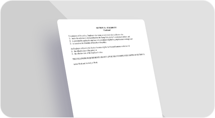 SECTION3A-ELIGIBILITY Continued For purposes of the policy, Employee also means an individual who is a Retiree who: 1) meetstheretirement criteria defined by the Group Policyholder’s employment policies; and 2) is permitted by applicable state law to be considered eligible for group insurance coverage; and 3) is named on the Schedule of Benefits of the policy. AnEmployeedefinedinthisSectionbecomeseligiblefor Personal Insurance on the later of: 1) the effective date of the policy; or 2) the effective date of the Employee’s class. THEFOLLOWINGREQUIREMENTSARENOTAPPLICABLETOEMPLOYEESDEFINEDINSECTION3A: Active Work and Actively at Work. GC2510.4/1 SECTION3A-ELIGIBILITY