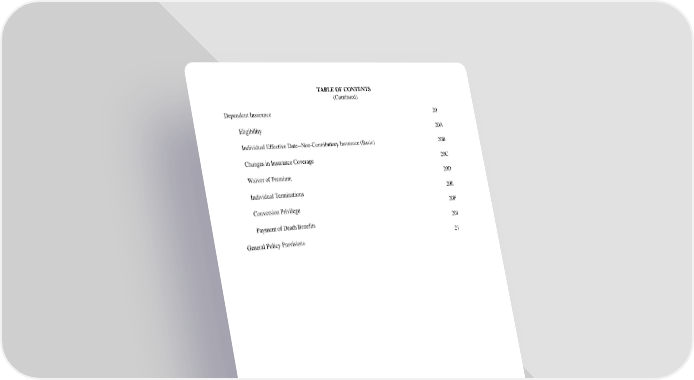 GC 2510.1 TABLE OF CONTENTS TABLE OF CONTENTS (Continued) Dependent Insurance 20 Eligibility 20A Individual Effective Date--Non-Contributory Insurance (Basic) 20B Changes in Insurance Coverage 20C Waiver of Premium 20D Individual Terminations 20E Conversion Privilege 20F Payment of Death Benefits 20J General Policy Provisions 21