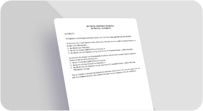 GC 2510.21 SECTION 20 - DEPENDENT INSURANCE SECTION 20A - ELIGIBILITY SECTION 20 - DEPENDENT INSURANCE SECTION 20A - ELIGIBILITY ELIGIBILITY All Dependents must be legally authorized to reside in the United States under applicable state and federal laws. An individual who is Your Dependent on the effective date of the policy becomes eligible for Dependent Insurance on the later of the following dates: 1) the effective date of the policy; 2) the date You become eligible for Personal Insurance; or 3) the effective date that Dependent coverage under Section 20, Dependent Insurance, is added to the policy. An individual who becomes Your Dependent after the effective date of the policy becomes eligible for Dependent Insurance on the later of the following dates: 1) the date You become eligible for Personal Insurance; 2) the date the individual becomes Your Dependent; or 3) the effective date that Dependent coverage under Section 20, Dependent Insurance, is added to the Group Policyholder’s coverage. You, as a condition of insuring Your Dependent(s), must make written election to AUL on a form approved by AUL and, for Contributory Insurance, must contribute the required amount of premium to AUL on a timely basis.