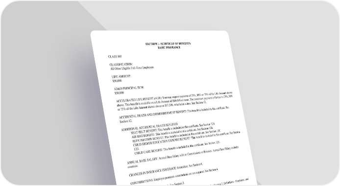 SECTION 1 - SCHEDULE OF BENEFITS BASIC INSURANCE GC 2510.2 SECTION 1 - SCHEDULE OF BENEFITS CLASS 003 CLASSIFICATION: All Other Eligible Full-Time Employees LIFE AMOUNT: $50,000 AD&D PRINCIPAL SUM: $50,000 ACCELERATED LIFE BENEFIT (ALB): You may request payment of 25%, 50% or 75% of the Life Amount shown above. This benefit is available on a Life Amount of $10,000 or more. The maximum payment is limited to 25%, 50% or 75% of the Life Amount shown above or $37,500, whichever is less. See Section 13. ACCIDENTAL DEATH AND DISMEMBERMENT BENEFIT: This benefit is included in this certificate. See Section 12. ADDITIONAL ACCIDENTAL DEATH BENEFITS: SEAT BELT BENEFIT: This benefit is included in this certificate. See Section 12A. AIR BAG BENEFIT: This benefit is included in this certificate. See Section 12B. REPATRIATION BENEFIT: This benefit is included in this certificate. See Section 12C. CHILD HIGHER EDUCATION EXPENSE BENEFIT: This benefit is included in this certificate. See Section 12D. CHILD CARE BENEFIT: This benefit is included in this certificate. See Section 12E. ANNUAL BASE SALARY: Annual Base Salary with no Commissions or Bonuses. Annual Base Salary excludes overtime. CHANGES IN INSURANCE COVERAGE: Immediate. See Section 6. CONTRIBUTIONS: Employee premium contributions are not required. See Section 4. ELIGIBILITY: First of the Month. See Section 3. FULL-TIME EMPLOYEE REQUIREMENT: 30 hours or more per week. See Section 2, Definitions - Employee, and Section 3, Eligibility.