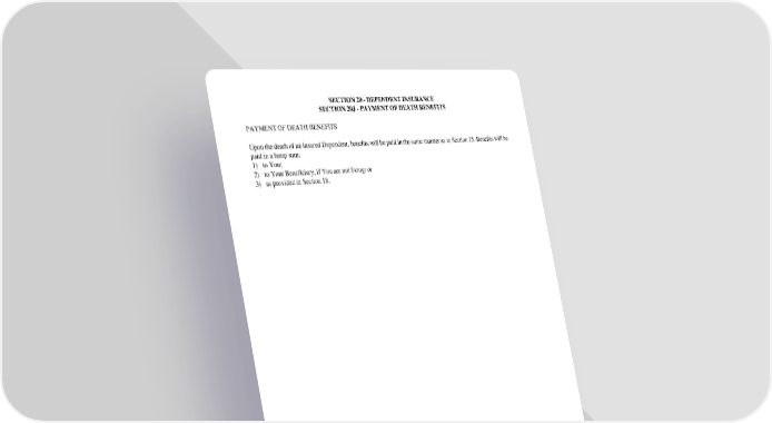 GC 2510.32 SECTION 20 - DEPENDENT INSURANCE SECTION 20J - PAYMENT OF DEATH BENEFITS SECTION 20 - DEPENDENT INSURANCE SECTION 20J - PAYMENT OF DEATH BENEFITS PAYMENT OF DEATH BENEFITS Upon the death of an insured Dependent, benefits will be paid in the same manner as in Section 15. Benefits will be paid in a lump sum: 1) to You; 2) to Your Beneficiary, if You are not living; or 3) as provided in Section 18.