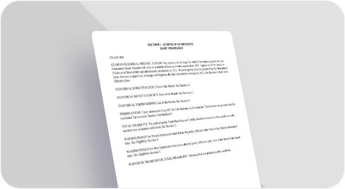 SECTION 1 - SCHEDULE OF BENEFITS BASIC INSURANCE GC 2510.2 SECTION 1 - SCHEDULE OF BENEFITS CLASS 004 GUARANTEED ISSUE AMOUNT: $350,000. Any amount of coverage for which You request greater than the Guaranteed Issue Amount will only be available following written approval by AUL. Approval will be based on Evidence of Insurability and information satisfactory to AUL. If coverage for amounts greater than the Guaranteed Issue Amount is approved, coverage will begin on the date identified in writing by AUL. See Section 4, Individual Effective Date. INDIVIDUAL EFFECTIVE DATE: First of the Month. See Section 4. INDIVIDUAL REINSTATEMENTS: First of the Month. See Section 11. INDIVIDUAL TERMINATIONS: End of the Month. See Section 9. TERMINATIONS: Upon attainment of age 65, the Life Insurance will terminate. Terminations are governed by the Individual Terminations Section. See Section 9. TOTAL DISABILITY: The definition for Total Disability and Totally Disabled included in this certificate is the standard any occupation definition. See Section 2. WAITING PERIOD for Present Employees hired before the policy effective date: First of the Month following 0 days. See Eligibility Section 3. WAITING PERIOD for New Employees hired on or after the policy effective date: First of the Month following 0 days. See Eligibility Section 3. WAIVER OF PREMIUM FOR TOTAL DISABILITY: This benefit is not included in this certificate.