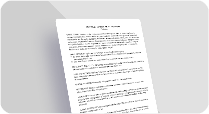 GC 2510.33/1 SECTION 21 - GENERAL POLICY PROVISIONS SECTION 21 - GENERAL POLICY PROVISIONS Continued GRACE PERIOD: Premiums are due monthly and must be received by AUL within the required time frame for coverage to remain in force. You are entitled to a grace period of 31 calendar days for the payment of any premium due except the first. During the grace period, the insurance coverage shall continue in force, unless AUL has received written notice of termination in advance of date of termination and in accordance with the terms of the policy. Group Policyholder is liable to AUL for the payment of a pro rata premium for the time the policy was in force during the grace period. If the required amount of premium is not received by the end of the grace period, the insurance will terminate as of the last day of coverage for which premium was paid. LEGAL ACTION: No legal action may be brought to obtain benefits under the policy: 1) for at least 60 days after proof of loss has been furnished and before arbitration is held pursuant to the arbitration provisions in the policy; or 2) after three (3) years from the time written proof of loss is required to have been furnished to AUL. CONFORMITY WITH STATE LAWS: Any provision of the policy in conflict with the laws of the state in which it is delivered is amended to conform to the minimum requirements of those laws. DATA AND RECORDS: The Group Policyholder must furnish information which AUL reasonably requires. The Group Policyholder’s documents which may have a bearing on the insurance shall be open for inspection by AUL at all reasonable times. GENDER PRONOUNS: Whenever the male pronoun is used, it shall also mean the female. CERTIFICATES: If there is any discrepancy between the provisions of any certificate and the provisions of the policy, the provisions of the policy will govern. ASSIGNMENT: You may make an absolute assignment of all benefits and rights of Your coverage. Any coverage is assignable to the extent permitted by law except that no collateral assignment is permitted. No assignment is binding unless filed with AUL in a form acceptable to it. AUL assumes no responsibility for the validity or effect of any assignment. CLAIMS OF CREDITORS: The benefits paid under the policy will be exempt from the claims of creditors to the maximum extent permitted by law. CLERICAL ERROR: Clerical error on the part of the Group Policyholder or AUL will not invalidate insurance otherwise in force or continue insurance otherwise validly terminated. Upon discovery of an error, an equitable adjustment will be made in the premiums and/or benefits, if appropriate. MISSTATEMENT OF AGE: If Your age or Your Dependent has been misstated, the benefits will be payable based on the true facts. Premium adjustment will be made so that AUL will receive the actual premium required based on the true facts. Any adjustment of benefits due to the correction of age will also be made.