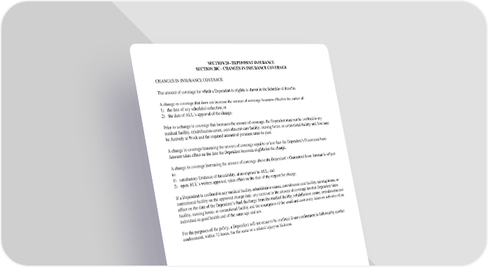 GC 2510.24-1 SECTION 20 - DEPENDENT INSURANCE (Immediate) SECTION 20C - CHANGES IN INSURANCE SECTION 20 - DEPENDENT INSURANCE SECTION 20C - CHANGES IN INSURANCE COVERAGE CHANGES IN INSURANCE COVERAGE The amount of coverage for which a Dependent is eligible is shown in the Schedule of Benefits. A change in coverage that does not increase the amount of coverage becomes effective the earlier of: 1) the date of any scheduled reduction; or 2) the date of AUL’s approval of the change. Prior to a change in coverage that increases the amount of coverage, the Dependent must not be confined in any medical facility, rehabilitation center, convalescent care facility, nursing home, or correctional facility and You must be Actively at Work and the required amount of premium must be paid. A change in coverage increasing the amount of coverage equal to or less than the Dependent’s Guaranteed Issue Amount takes effect on the date the Dependent becomes eligible for the change. A change in coverage increasing the amount of coverage above the Dependent’s Guaranteed Issue Amount is subject to: 1) satisfactory Evidence of Insurability, at no expense to AUL; and 2) upon AUL’s written approval, takes effect on the date of the request for change. If a Dependent is confined in any medical facility, rehabilitation center, convalescent care facility, nursing home, or correctional facility on the approved change date, any increase in the amount of coverage for that Dependent takes effect on the date of the Dependent’s final discharge from the medical facility, rehabilitation center, convalescent care facility, nursing home, or correctional facility and the resumption of the usual and customary duties or activities of an individual in good health and of the same age and sex. For the purposes of the policy, a Dependent will not cease to be confined if one confinement is followed by another confinement, within 72 hours, for the same or a related injury or Sickness.