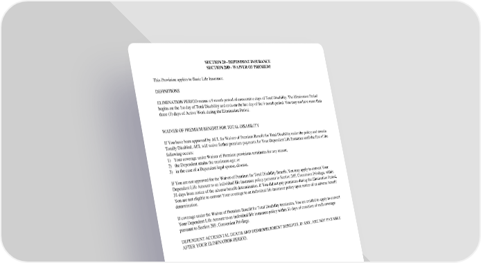 GC 2510.25 SECTION 20 - DEPENDENT INSURANCE SECTION 20D - WAIVER OF PREMIUM SECTION 20 - DEPENDENT INSURANCE SECTION 20D - WAIVER OF PREMIUM This Provision applies to Basic Life Insurance. DEFINITIONS ELIMINATION PERIOD means a 9 month period of consecutive days of Total Disability. The Elimination Period begins on the 1st day of Total Disability and ends on the last day of the 9 month period. You may not have more than three (3) days of Active Work during the Elimination Period. WAIVER OF PREMIUM BENEFIT FOR TOTAL DISABILITY If You have been approved by AUL for Waiver of Premium Benefit for Total Disability under the policy and remain Totally Disabled, AUL will waive further premium payments for Your Dependent Life Insurance until the first of the following occurs: 1) Your coverage under Waiver of Premium provisions terminates for any reason; 2) the Dependent attains the maximum age; or 3) in the case of a Dependent legal spouse, divorce. If You are not approved for the Waiver of Premium for Total Disability Benefit, You may apply to convert Your Dependent Life Amount to an individual life insurance policy pursuant to Section 20F, Conversion Privilege, within 31 days from notice of the adverse benefit determination. If You did not pay premiums during the Elimination Period, You are not eligible to convert Your coverage to an individual life insurance policy upon notice of an adverse benefit determination. If coverage under the Waiver of Premium Benefit for Total Disability terminates, You are entitled to apply to convert Your Dependent Life Amount to an individual life insurance policy within 31 days of cessation of such coverage pursuant to Section 20F, Conversion Privilege. DEPENDENT ACCIDENTAL DEATH AND DISMEMBERMENT BENEFITS, IF ANY, ARE NOT PAYABLE AFTER YOUR ELIMINATION PERIOD.