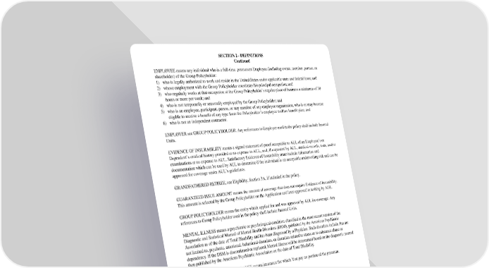 SECTION2-DEFINITIONS Continued EMPLOYEEmeansanyindividualwhoisafull-time,permanentEmployee(includingowner,member,partner,or shareholder) of the Group Policyholder: 1) whoislegally authorized to work and reside in the United States under applicable state and federal laws; and 2) whoseemploymentwiththeGroupPolicyholderconstituteshis principal occupation; and 3) whoregularlyworksatthat occupation at the Group Policyholder’s regular place of business a minimum of 30 hours or more per week; and 4) whoisnottemporarilyor seasonally employed by the Group Policyholder; and 5) whoisanemployee,participant, person, or any member of any employee organization, who is or may become eligible to receive a benefit of any type from the Policyholder’s employee welfare benefit plan; and 6) whoisnotanindependentcontractor. EMPLOYERseeGROUPPOLICYHOLDER.AnyreferencestoEmployerusedinthepolicyshallincludeInsured Units. EVIDENCEOFINSURABILITYmeansasignedstatementofproofacceptabletoAULofanEmployee’sor Dependent’s medical history provided at no expense to AUL, and, if requested by AUL, medical records, tests, and/or examinations at no expense to AUL. Satisfactory Evidence of Insurability must include information and documentation which can be used by AUL to determine if the individual is an acceptable underwriting risk and can be approved for coverage under AUL’s guidelines. GRANDFATHEREDRETIREE,seeEligibility,Section3A,ifincludedinthepolicy. GUARANTEEDISSUEAMOUNTmeanstheamountofcoveragethatdoesnotrequireEvidenceofInsurability. This amount is selected by the Group Policyholder on the Application and later approved in writing by AUL. GROUPPOLICYHOLDERmeanstheentitywhichappliedforandwasapprovedbyAULforcoverage.Any references to Group Policyholder used in the policy shall include Insured Units. MENTALILLNESSmeansapsychiatricorpsychologicalconditionclassifiedin the most recent version of the Diagnostic and Statistical Manual of Mental Health Disorders (DSM), published by the American Psychiatric Association as of the date of Total Disability and has been diagnosed by a Physician. Such disorders include, but are not limited to, psychotic, emotional, behavioral disorders, or disorders related to stress or to substance abuse or dependency. If the DSM is discontinued or replaced, Mental Illness will be determined based on the diagnostic manual then published by the American Psychiatric Association on the date of Total Disability. NON-CONTRIBUTORYINSURANCEmeansinsuranceforwhichYoupaynoportionofthepremium. GC2510.3/2A SECTION2-DEFINITIONS (Probationary Elig Not Inc)