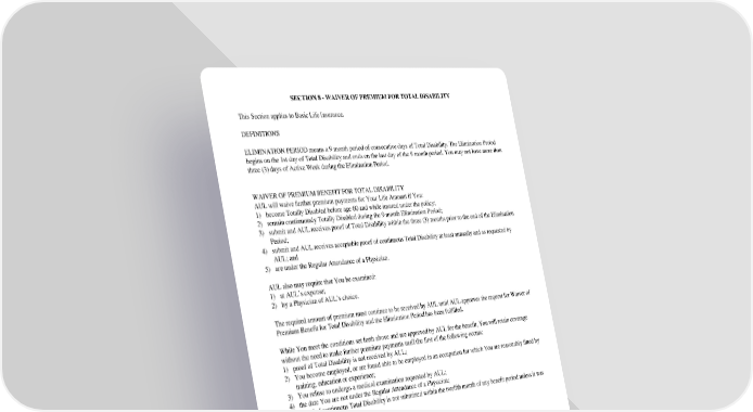 SECTION8-WAIVEROFPREMIUMFORTOTALDISABILITY This Section applies to Basic Life Insurance. DEFINITIONS ELIMINATIONPERIODmeansa9monthperiodofconsecutivedaysofTotalDisability.TheEliminationPeriod begins on the 1st day of Total Disability and ends on the last day of the 9 month period. You may not have more than three (3) days of Active Work during the Elimination Period. WAIVEROFPREMIUMBENEFITFORTOTALDISABILITY AULwillwaivefurtherpremiumpaymentsforYourLifeAmountifYou: 1) becomeTotallyDisabledbefore age 60 and while insured under the policy; 2) remaincontinuously Totally Disabled during the 9 month Elimination Period; 3) submit and AULreceivesproof of Total Disability within the three (3) months prior to the end of the Elimination Period; 4) submit and AULreceivesacceptableproof of continuous Total Disability at least annually and as requested by AUL;and 5) are under the Regular Attendance of a Physician. AULalsomayrequirethatYoubeexamined: 1) at AUL’sexpense; 2) byaPhysicianofAUL’schoice. Therequired amount of premium must continue to be received by AUL until AUL approves the request for Waiver of PremiumBenefitfor Total Disability and the Elimination Period has been fulfilled. WhileYoumeettheconditionssetforth above and are approved by AUL for the benefit, You will retain coverage without the need to make further premium payments until the first of the following occurs: 1) proof of Total Disability is not received by AUL; 2) Youbecomeemployed,orarefoundabletobeemployedinanoccupationforwhichYouarereasonablyfittedby training, education or experience; 3) Yourefusetoundergoamedicalexaminationrequestedby AUL; 4) the date You are not under the Regular Attendance of a Physician; 5) proof of continuous Total Disability is not submitted within the twelfth month of any benefit period unless it was not possible to do so; 6) Youattainage70;or 7) if You retire; 8) Yourclassterminates; or 9) YouarenolongerTotallyDisabled. GC2510.10 SECTION8-WAIVEROFPREMIUMFORTOTALDISABILITY (NoRetiree)