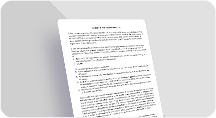 SECTION10-CONVERSIONPRIVILEGE If Your coverage, or a portion of it, terminates because You are no longer eligible for coverage under the policy, You mayapplyforanindividual life insurance conversion policy without evidence of insurability. The coverage amount of the individual life insurance conversion policy shall not exceed the amount of life insurance that ceases because of loss of eligibility for coverage under the policy minus the amount of any group life coverage for which You become eligible within 31 days of termination. If Your coverage ceases due to termination of the policy, You may apply for and receive an individual life insurance conversion policy if Your group life insurance has been in force with AUL for five (5) continuous years before the termination date. The coverage amount of the individual life insurance conversion policy may not exceed the LESSER of: 1) the amount of life insurance that ceases because of termination minus the amount of any group life coverage for whichYoubecomeeligiblewithin31daysoftermination;or 2) $10,000. Theconversion privilege is subject to the following: 1) Written application must be made and the first premium must be paid within 31 days after the date of termination of insurance. 2) Anindividual life insurance policy, other than term life insurance, offered by AUL at the time of conversion, may be selected. 3) ThepremiumontheindividualpolicymustbeatAUL’sthencustomaryrateapplicableto the form and amount of the individual policy, to the class of risk to which You or Your dependent then belong, and to the individual age attained by You or Your dependent on the effective date of the individual policy. 4) Theindividual life insurance conversion policy takes effect on the last day of the application period and is in lieu of all benefits under the Policy. If notice of the existence of the conversion right is not given at least 15 days before the expiration of the period during whichthe conversion application and payment of the first premium must be made under the terms of the policy, You have an additional period within which to exercise the conversion right. The additional conversion application period created to exercise a right of conversion expires 15 days after You are given notice of the conversion right. However, irrespective of the date on which notice is given or of the absence of any notice, the additional conversion application period may not extend beyond 60 days after the expiration date of the period within which conversion application period and payment of the first premium were to be made under the terms of the policy. For purposes of this section, notice of the right of conversion may be given to You in writing, presented to You; mailed by the Group Policyholder to Your last known address; or mailed by the insurer to Your last known address as furnished by the Group Policyholder. If death occurs during the conversion application period, AUL will pay the Life Amount available for conversion whether or not the application or the first premium payment has been made. After the 31-day period, no conversion application will be accepted unless it is proven that it was not possible for You to apply in a timely fashion. The individual life insurance conversion policy will not include Accidental Death benefits or any other benefits currently in force under the policy. PremiummustbepaidtoandreceivedbyAULforcoverageduringtheconversionapplicationperiod. IF DEATHOCCURSDURINGTHECONVERSIONAPPLICATIONPERIOD,INNOEVENTWILLBENEFITS BEPAYABLEUNDERBOTHTHEINDIVIDUALCONVERSIONPOLICYANDTHEPOLICY.ACCIDENTAL DEATHANDDISMEMBERMENTBENEFITS,IFANY,ARENOTPAYABLEBEYONDTHEDATES OUTLINEDINSECTION9,INDIVIDUALTERMINATIONS. GC2510.12 SECTION10-CONVERSIONPRIVILEGE (AD&D:Included)