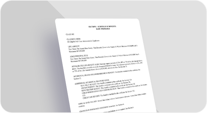 SECTION1-SCHEDULEOFBENEFITS BASICINSURANCE CLASS002 CLASSIFICATION: All Eligible Full-Time Administrative Employees LIFEAMOUNT: TwoTimesTheAnnualBaseSalary,ThenRoundedDowntotheNearest$1WithAMinimumOf$10,000AndA MaximumOf$350,000 AD&DPRINCIPALSUM: TwoTimesTheAnnualBaseSalary,ThenRoundedDowntotheNearest$1WithAMinimumOf$10,000AndA MaximumOf$350,000 ACCELERATEDLIFEBENEFIT(ALB):Youmayrequestpaymentof25%,50%or75%oftheLifeAmountshown above. This benefit is available on a Life Amount of $10,000 or more. The maximum payment is limited to 25%, 50% or 75% of the Life Amount shown above or $250,000, whichever is less. See Section 13. ACCIDENTALDEATHANDDISMEMBERMENTBENEFIT:Thisbenefitisincludedinthiscertificate.See Section 12. ADDITIONALACCIDENTALDEATHBENEFITS: SEATBELTBENEFIT:Thisbenefitisincludedinthiscertificate.SeeSection12A. AIRBAGBENEFIT:Thisbenefitisincludedinthiscertificate.SeeSection12B. REPATRIATIONBENEFIT:Thisbenefitisincludedinthiscertificate.SeeSection12C. CHILDHIGHEREDUCATIONEXPENSEBENEFIT:Thisbenefitisincludedinthiscertificate.SeeSection 12D. CHILDCAREBENEFIT:Thisbenefitisincludedinthiscertificate.SeeSection12E. ANNUALBASESALARY:AnnualBaseSalarywithnoCommissionsorBonuses.AnnualBaseSalaryexcludes overtime. CHANGESININSURANCECOVERAGE:Immediate.SeeSection6. CONTRIBUTIONS:Employeepremiumcontributionsarenotrequired.SeeSection4. ELIGIBILITY:First of the Month. See Section 3. FULL-TIMEEMPLOYEEREQUIREMENT:30hoursormoreperweek.SeeSection2,Definitions-Employee,and Section 3, Eligibility. GC2510.2 SECTION1-SCHEDULEOFBENEFITS