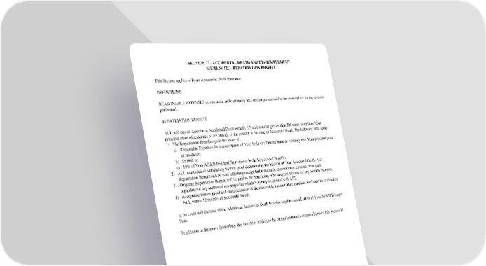 SECTION12-ACCIDENTALDEATHANDDISMEMBERMENT SECTION12C-REPATRIATIONBENEFIT This Section applies to Basic Accidental Death Insurance. DEFINITIONS REASONABLEEXPENSESmeansusualandcustomaryfeesorchargesassessedinthemarketplacefortheservices performed. REPATRIATIONBENEFIT AULwillpayanAdditionalAccidentalDeathBenefitif You die either greater than 200 miles away from Your principal place of residence or are outside of the country at the time of Accidental Death. The following rules apply: 1) TheRepatriation Benefit equals the lesser of: a) Reasonable Expenses for transportation of Your body to a funeral home or mortuary near Your principal place of residence; b) $5,000; or c) 10%ofYourAD&DPrincipalSumshownintheScheduleofBenefits. 2) AULmustreceivesatisfactorywritten proof documenting the location of Your Accidental Death. Any Repatriation Benefit will be paid following receipt that reasonable transportation expenses were paid. 3) OnlyoneRepatriationBenefit will be paid to the beneficiary who has paid the cost for any covered expenses, regardless of any additional coverages for which You may be insured with AUL. 4) Acceptablewritten proof and documentation of the reasonable transportation expenses paid must be received by AULwithin12monthsofAccidentalDeath. In no event will the total of the Additional Accidental Death Benefits payable exceed 100% of Your AD&D Principal Sum. In addition to the above limitations, this benefit is subject to the further limitations and provisions of this Section 12. GC2510.15-2 SECTION12-ACCIDENTALDEATHANDDISMEMBERMENT SECTION12C-REPATRIATIONBENEFIT