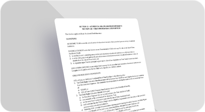 SECTION12-ACCIDENTALDEATHANDDISMEMBERMENT SECTION12D-CHILDHIGHEREDUCATIONBENEFIT This Section applies to Basic Accidental Death Insurance. DEFINITIONS ACADEMICYEARmeanstheannualperiodofeducationalsessionsofanaccreditedpost-secondaryeducational institution. ELIGIBLESTUDENTunderthisSectionmeansYourunmarriedChildunderage26,whoonthedateofYour Accidental Death: 1) is enrolled in and is attending an accredited post-secondary educational institution on a full-time basis; or 2) is at the 12th grade level and enrolls and attends an accredited post-secondary educational institution within 16 months from the date of Your death; and 3) is dependent upon You for principal support and is claimed as a dependent on Your federal income tax return. EDUCATIONEXPENSESmeanstuitionthatisassessedbytheaccreditedpostsecondaryeducationalinstitutionand is required to be paid in order for the Child to be classified as a full time student. CHILDHIGHEREDUCATIONBENEFIT AULwillpayanAdditionalAccidentalDeathBenefitsubjectto the following rules: 1) TheChildHigherEducationBenefitpaymentwillbenomorethan$4,000foreachEligibleStudentperAcademic Yearfor Education Expenses. The cumulative benefit payments for all eligible students will not exceed the lesser of: a) $20,000; or b) 10%ofYourAD&DPrincipalSumInsuranceshownintheScheduleofBenefits. 2) TheChildHigherEducationBenefitwill be paid: a) for Education Expenses that are incurred and paid after Your Accidental Death; b) onceannually at the conclusion of the Academic Year; c) not for more than 5 consecutive years after the date of Your Accidental Death; d) until such date that the Child no longer satisfies eligibility requirements under the policy or the accredited post-secondary educational institution; e) following AUL’s receipt of documentation showing proof of paying Education Expenses, the Child Higher Education Benefit will be paid to any named beneficiary who paid Education Expenses; and f) in direct proportion to the amount of Education Expenses paid by each named beneficiary. 3) If there is no Eligible Student, no Child Higher Education Benefit will be paid. 4) Child Higher Education Benefits will only be paid based on enrollment in one accredited post-secondary educational institution. 5) NoannualChildHigherEducationBenefitswill be paid beyond the date the policy terminates. If the policy terminates within 60 days of the end of the current Academic Year, a final Child Higher Education Benefit will be paid when eligible. In no event will the total of the Additional Accidental Death Benefits payable exceed 100% of Your AD&D Principal Sum. In addition to the above limitations, this benefit is subject to the further limitations and provisions of this Section. GC2510.15-3 SECTION12-ACCIDENTALDEATHANDDISMEMBERMENT SECTION12D-CHILDHIGHEREDUCATIONBENEFIT