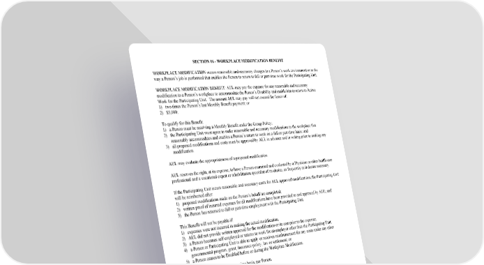 SECTION 16 - WORKPLACE MODIFICATION BENEFIT WORKPLACE MODIFICATION means reasonable and necessary changes to a Person’s work environment or to the way a Person’s job is performed that enables the Person to return to full or part-time work for the Participating Unit. WORKPLACE MODIFICATION BENEFIT: AUL may pay the expense for any reasonable and necessary modification to a Person’s workplace to accommodate the Person’s Disability and enable him to return to Active Work for the Participating Unit. The amount AUL may pay will not exceed the lesser of: 1) two times the Person’s last Monthly Benefit payment; or 2) $5,000. To qualify for this Benefit: 1) a Person must be receiving a Monthly Benefit under the Group Policy; 2) the Participating Unit must agree to make reasonable and necessary modifications to the workplace that reasonably accommodates and enables a Person’s return to work on a full or part-time basis; and 3) all proposed modifications and costs must be approved by AUL in advance and in writing prior to making any modification. AUL may evaluate the appropriateness of a proposed modification. AUL reserves the right, at its expense, to have a Person examined and evaluated by a Physician or other health care professional and a vocational expert or rehabilitation specialist of its choice, as frequently as it deems necessary. If the Participating Unit incurs reasonable and necessary costs for AUL approved modifications, the Participating Unit will be reimbursed after: 1) proposed modifications made on the Person’s behalf are completed; 2) written proof of incurred expenses for all modifications have been provided to and approved by AUL; and 3) the Person has returned to full or part-time employment with the Participating Unit. This Benefit will not be payable if: 1) expenses were not incurred in making the actual modification; 2) AUL did not provide written approval for the modification or its cost prior to the expense; 3) a Person becomes self-employed or returns to work for an employer other than the Participating Unit; 4) a Person or Participating Unit is able to apply or receives reimbursement for any costs under any other governmental program, grant, insurance policy, law or settlement; or 5) a Person ceases to be Disabled before or during the Workplace Modification. This benefit is available on a one-time basis, per Person. GC 3100.36A SECTION 16 - WORKPLACE MODIFICATION BENEFIT 2005