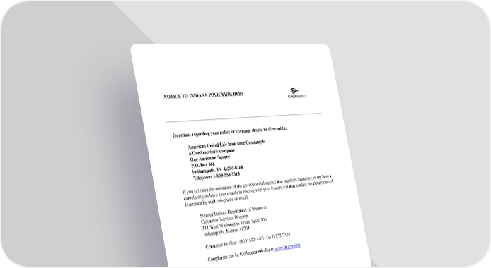 NOTICE TO INDIANA POLICYHOLDERS Questions regarding your policy or coverage should be directed to: American United Life Insurance Company® a OneAmerica® company One American Square P.O. Box 368 Indianapolis, IN 46206-0368 Telephone 1-800-553-5318 If you (a) need the assistance of the governmental agency that regulates insurance; or (b) have a complaint you have been unable to resolve with your insurer you may contact the Department of Insurance by mail, telephone or email: State of Indiana Department of Insurance Consumer Services Division 311 West Washington Street, Suite 300 Indianapolis, Indiana 46204 Consumer Hotline: (800) 622-4461; (317) 232-2395 Complaints can be filed electronically at www.in.gov/idoi. N-EB-IN 2007