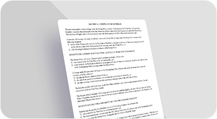 SECTION 12 - CONTINUITY OF COVERAGE This provision applies when coverage under the Group Policy replaces a Participating Unit's Prior Plan of Long Term Disability insurance that terminated on the day before the effective date of the Participating Unit under the Group Policy. This Section will apply only to Persons insured under the Participating Unit's Prior Plan on its termination date. Continuity of Coverage will apply to a Person who would not get full coverage under the Group Policy because of the following situations: 1) failure of the Person to be Actively At Work due to Disability or an approved Leave of Absence or temporary layoff on the effective date of the Participating Unit's coverage under the Group Policy; or 2) a Pre-Existing Condition limitation or exclusion of the Group Policy. BENEFITS FOR A PERSON WHO FAILS TO BE ACTIVELY AT WORK DUE TO DISABILITY The Group Policy will cover, subject to proper premium payments, a Person who: 1) was insured under the Prior Plan on its termination date; and 2) is not Actively At Work due to Disability or an approved Leave of Absence or temporary layoff on the effective date of the Participating Unit's coverage under the Group Policy. Coverage under this provision will begin on the Participating Unit’s effective date under the Group Policy and will continue until the earliest of: 1) the date the Person returns to Active Work; or 2) the end of any period of continuance or extension provided under the Prior Plan; or 3) the date coverage would otherwise end, according to the provisions of the AUL Group Policy. The benefits payable will be the same, as the Prior Plan would have paid, had coverage remained in force, less any amount for which the Prior Plan is liable. This Section of the Continuity of Coverage provision does not establish eligibility for such a Person under the Group Policy. Eligibility can only be met when the Person returns to full-time, Active Work as described in the Eligibility and Individual Effective Date Section. BENEFITS PAYABLE FOR A DISABILITY DUE TO A PRE-EXISTING CONDITION Benefits may be payable for a Disability due to a Pre-Existing Condition for a Person who: 1) was insured by the Prior Plan on its termination date; and 2) has been continuously covered under the AUL Group Policy from the effective date of the Participating Unit’s coverage under the Group Policy through the date the Person’s Disability began. The benefit payable will be determined by applying the Group Policy's Pre-Existing Condition exclusion. If the Injury or Sickness that causes a Person’s Disability is not excluded under the Pre-Existing Condition exclusion, then a Person will be paid the benefits of the Group Policy as selected by the Participating Unit. If the Injury or Sickness that causes a Person's Disability is excluded under the Pre-Existing Condition exclusion of the Group Policy, and such Injury or Sickness is not excluded under the Prior Plan’s Pre-Existing Condition exclusion, giving consideration for continuous time covered under both plans, the Person will be paid the lesser of: 1) the benefits of the Group Policy for the Participating Unit determined without application of the Pre-Existing Condition exclusion; or 2) the benefits of the Prior Plan. If the Injury or Sickness is excluded under the Prior Plan's Pre-Existing Condition exclusion, giving consideration for continuous time covered under both Plans, no benefits will be paid. GC 3100.31B SECTION 12 - CONTINUITY OF COVERAGE 2005 (LOA/Layoff/IMM)